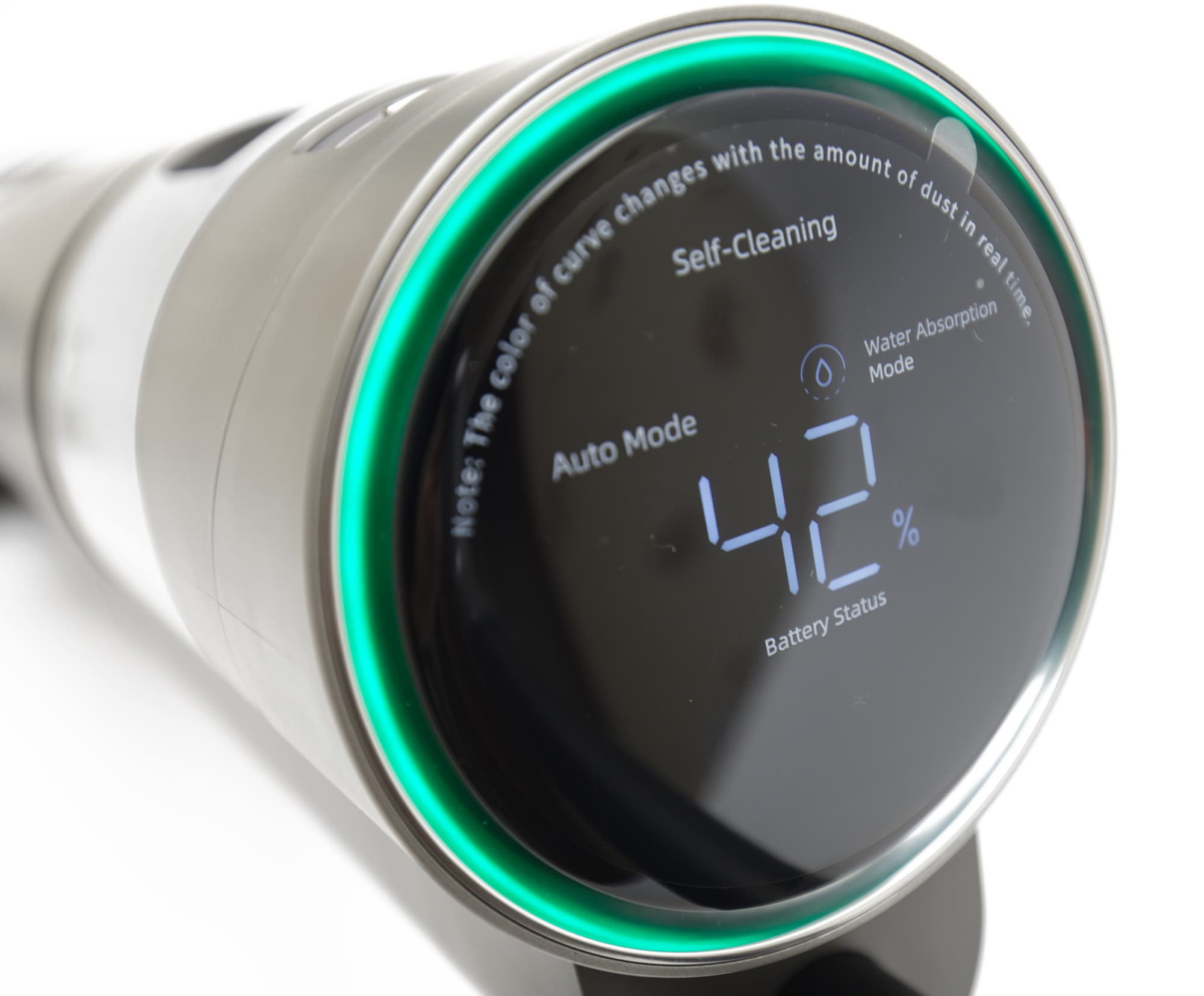 На круглом дисплее в верхнем торце моторного блока отображается текущий режим работы, а светящееся цветное кольцо вокруг служит индикатором уровня загрязнения: умеренно грязному полу соответствует зеленый цвет рамки, среднему — оранжевый, а очень испачканному — красный.