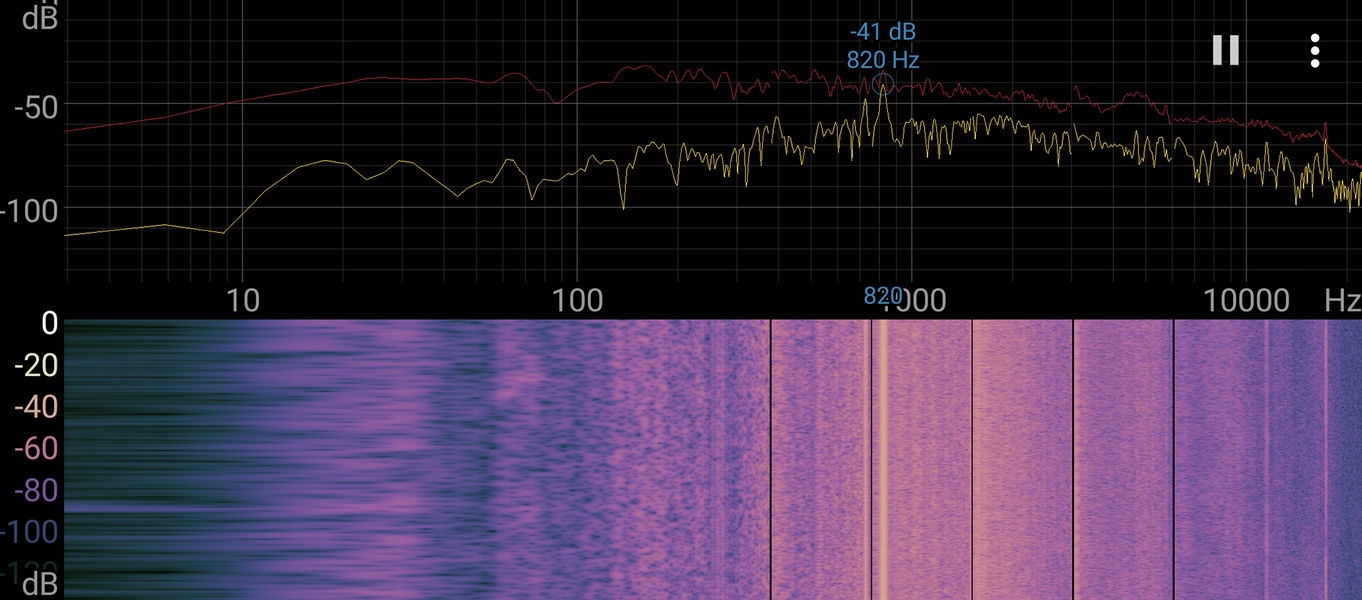 Шум пылесоса равномерный, с характерным стрекотанием воды, засасываемой в воздушный тракт, и заметным на сонограмме пиком в районе 800 Гц.