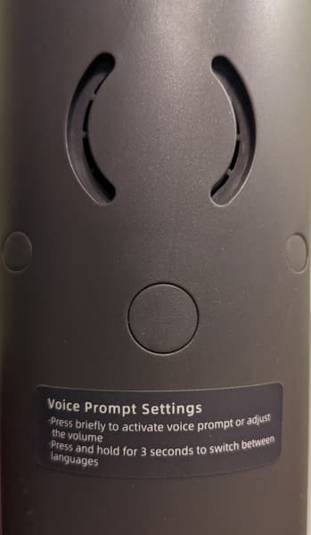 Сообщения на дисплее пылесос может дублировать словами через динамик (сзади на моторном блоке). Кнопка под ним позволяет отрегулировать громкость или выбрать язык интерфейса, если нажать на нее и держать дольше трех секунд. В устройстве доступны шесть голосовых пакетов, включая русский.