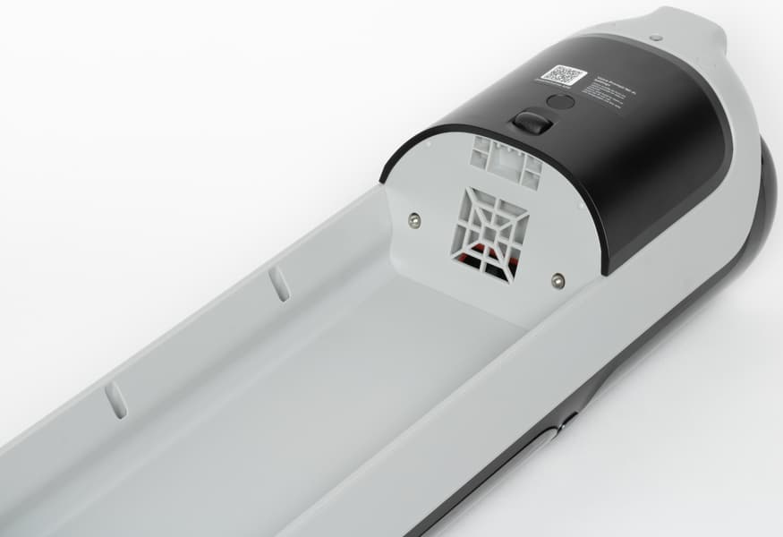 Блок управления размещается на D-образной рукоятке удлинительной ручки (ее после распаковки нужно «защелкнуть» на моторном блоке). Чтобы снять ручку, придется надавить на специальную утопленную кнопку (придется вооружиться небольшой отверткой или подобным устройством).