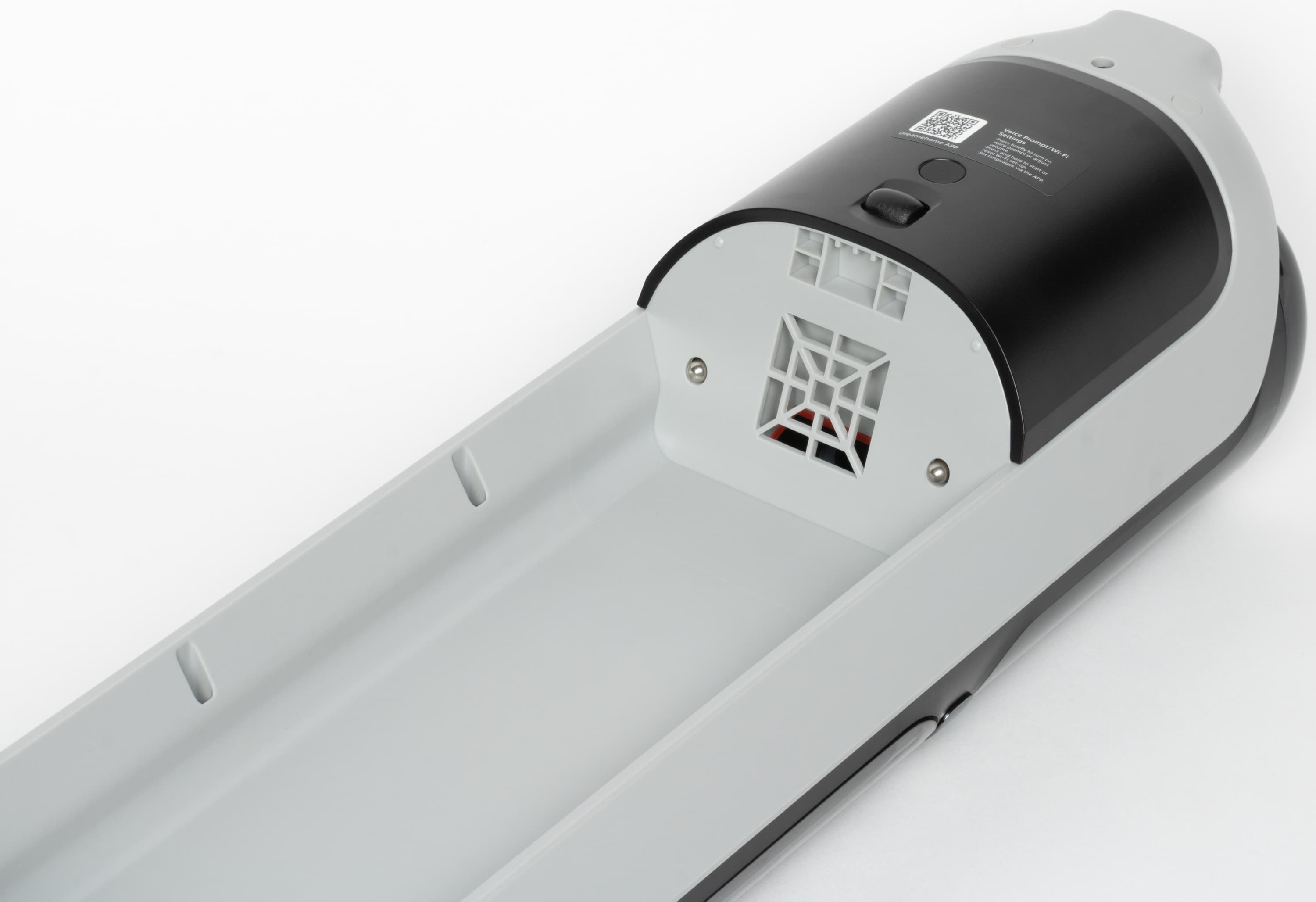 Опирается пылесос на два моторизированных крупных колеса в пяточной части насадки. Благодаря встроенному мотору колеса будут автоматически «подруливать» в сторону движения пылесоса, тем самым помогая пользователю перемещать довольно тяжелый корпус.