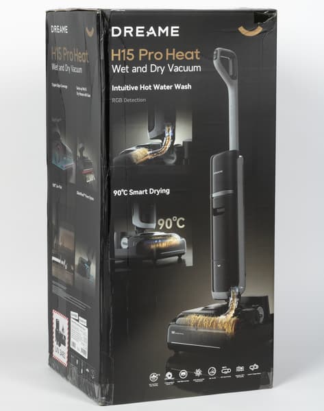 Внутри — парадная глянцевая коробка с полноцветной печатью. На лицевой стороне мы видим фотографию пылесоса, а также упоминание ключевых особенностей модели — мойка теплой водой, а также автоматическая сушка при 90 градусах.