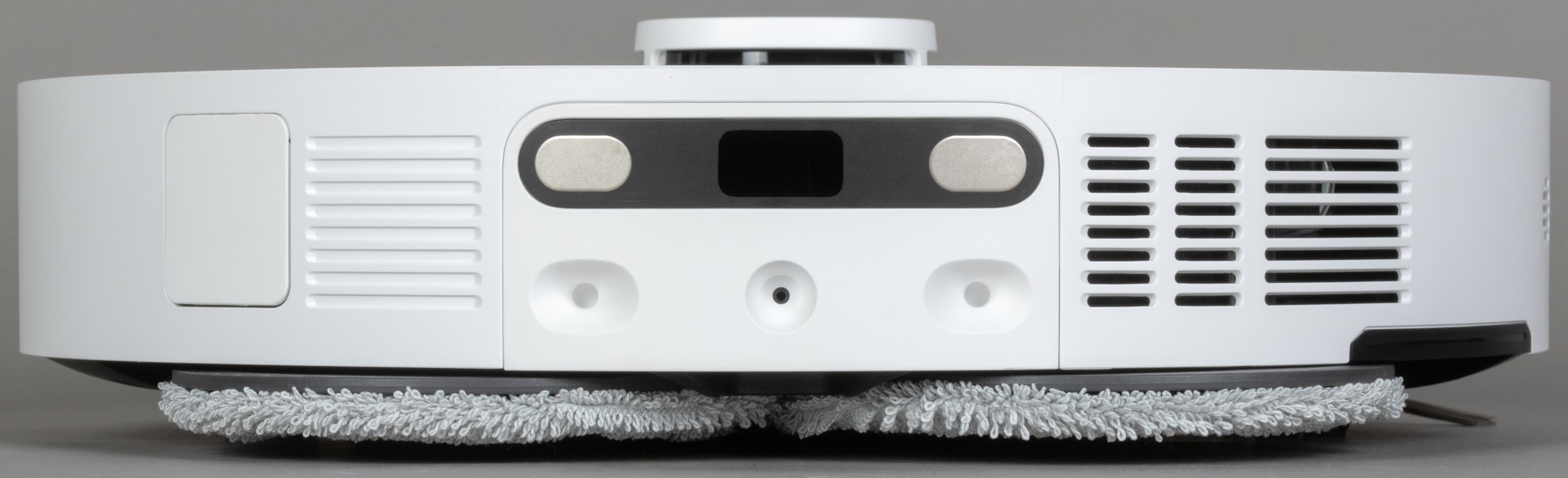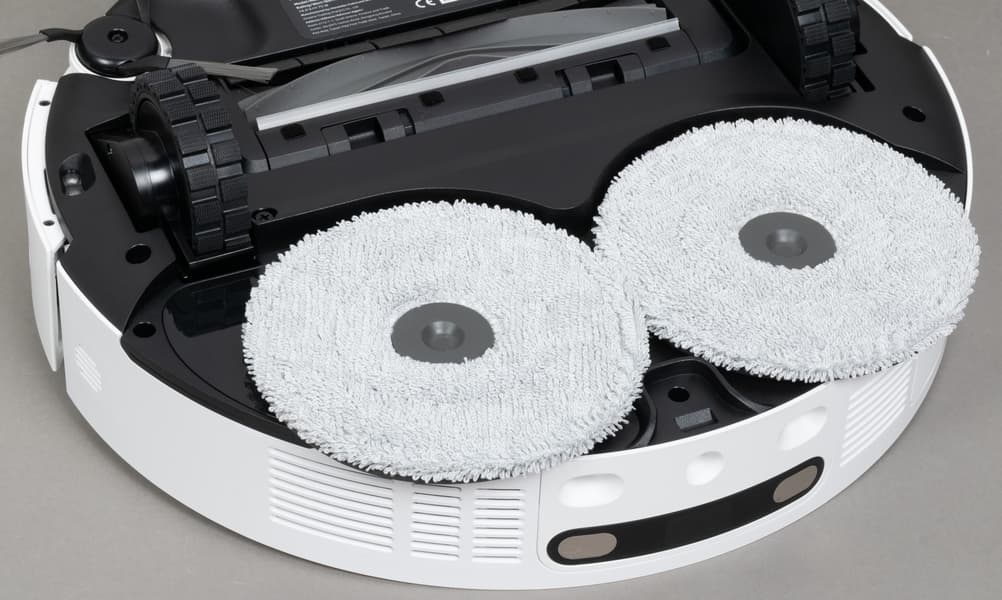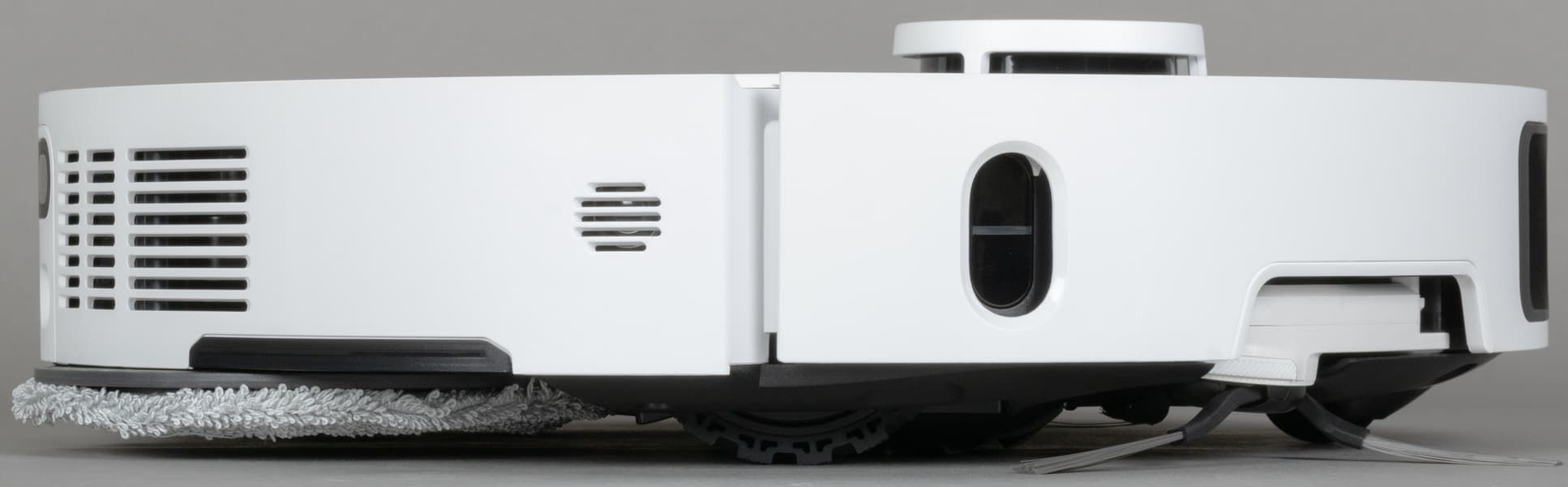 Решетка для выпуска воздуха расположена в «корме» робота, а под корпусом можно видеть насадку для влажной уборки с установленной микрофибровой салфеткой.