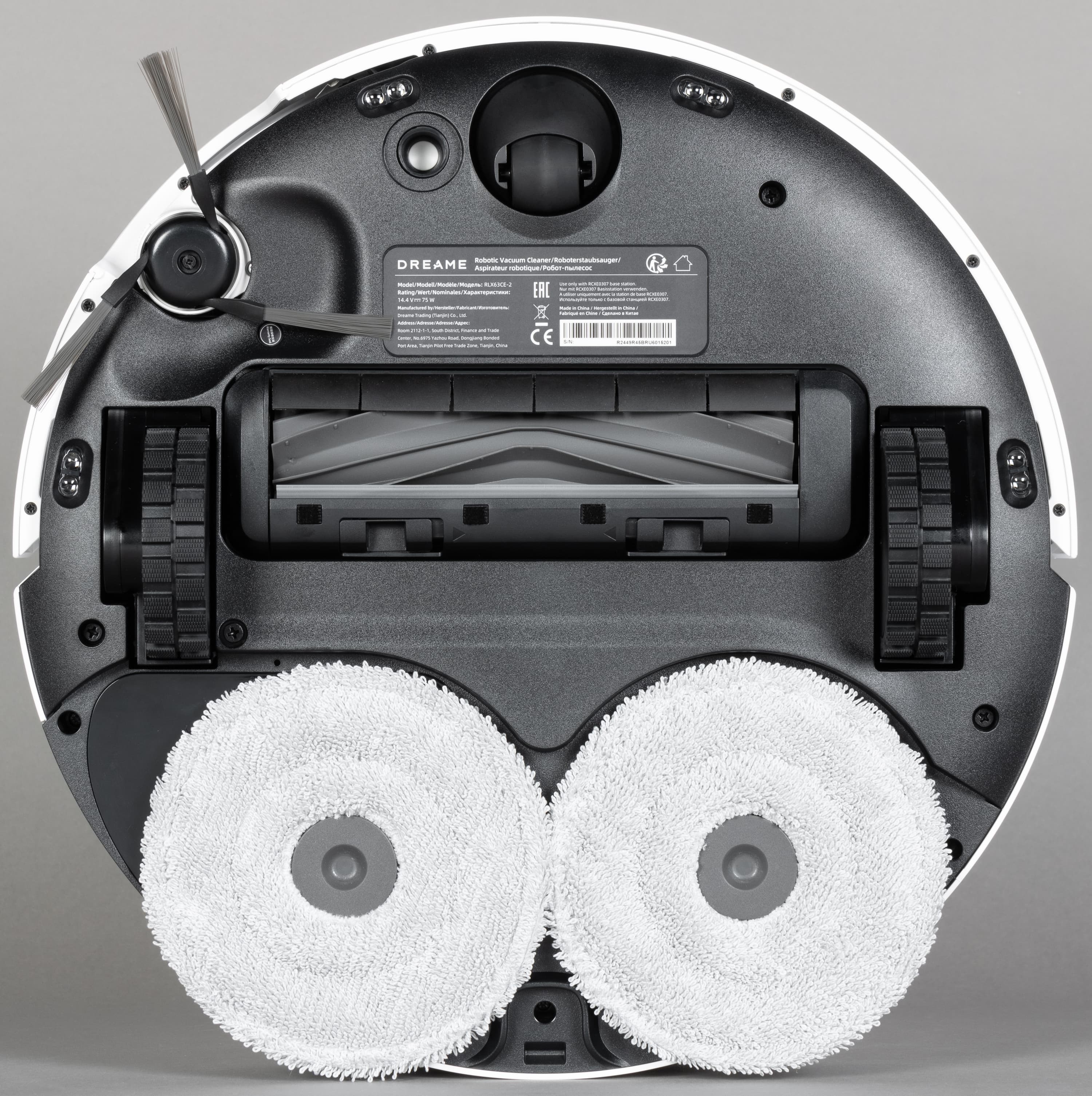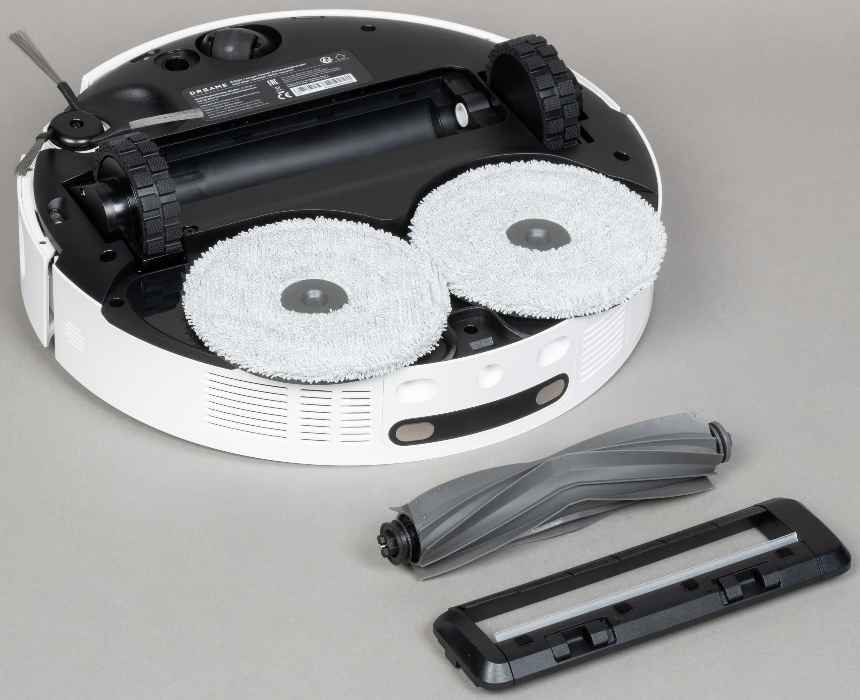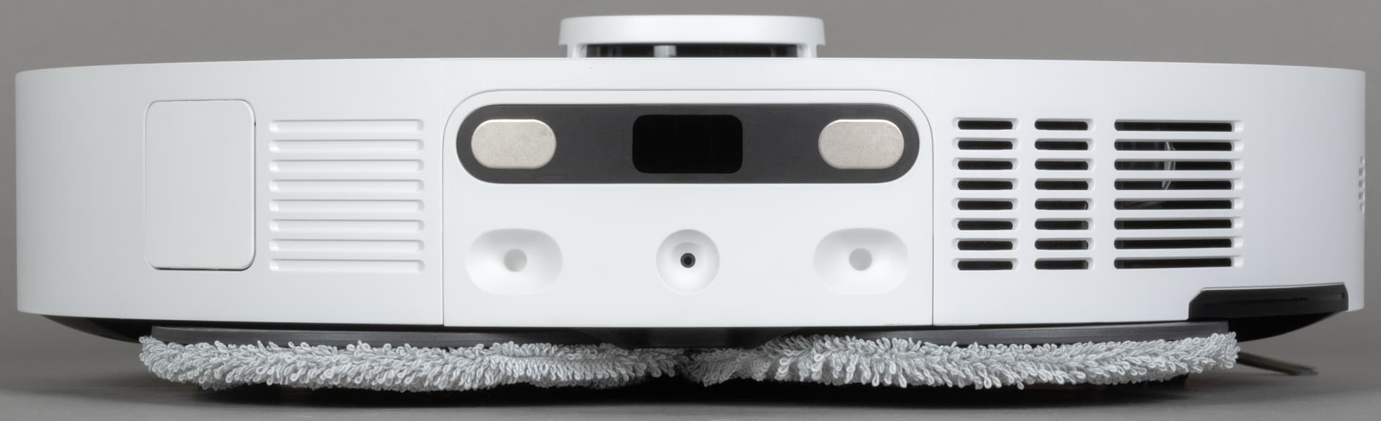 Решетка для выпуска воздуха расположена в «корме» робота, а под корпусом можно видеть насадку для влажной уборки с установленной микрофибровой салфеткой.