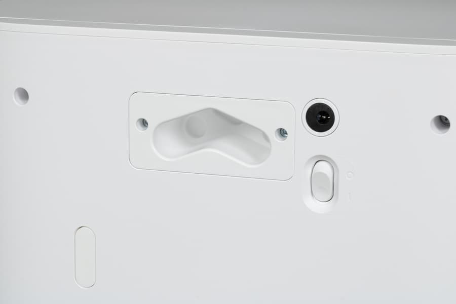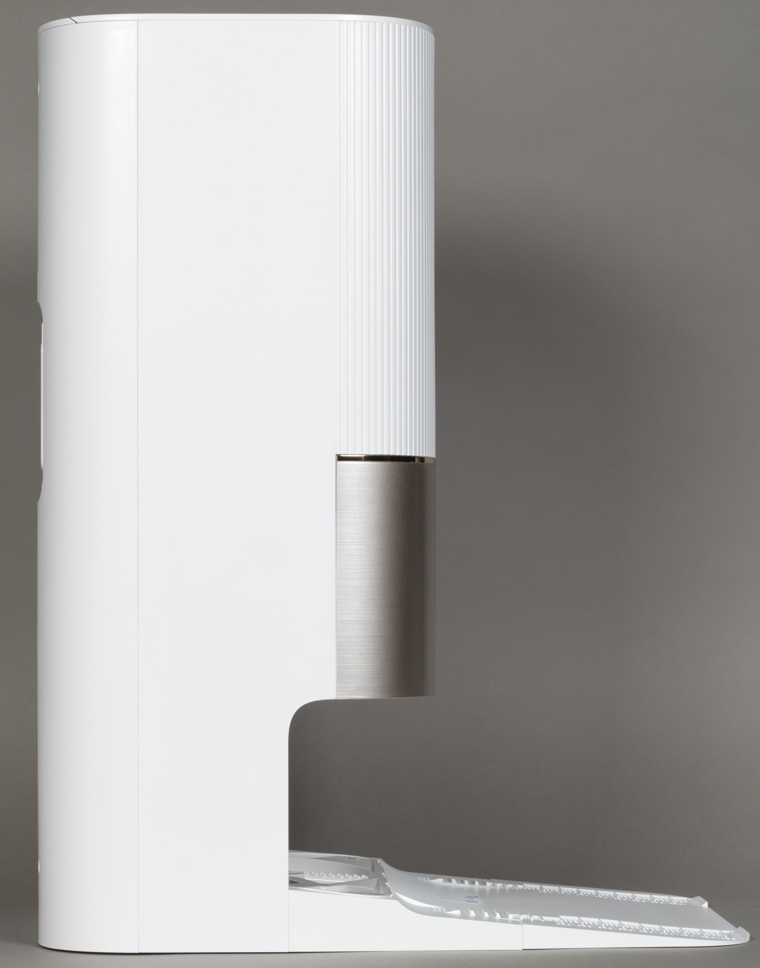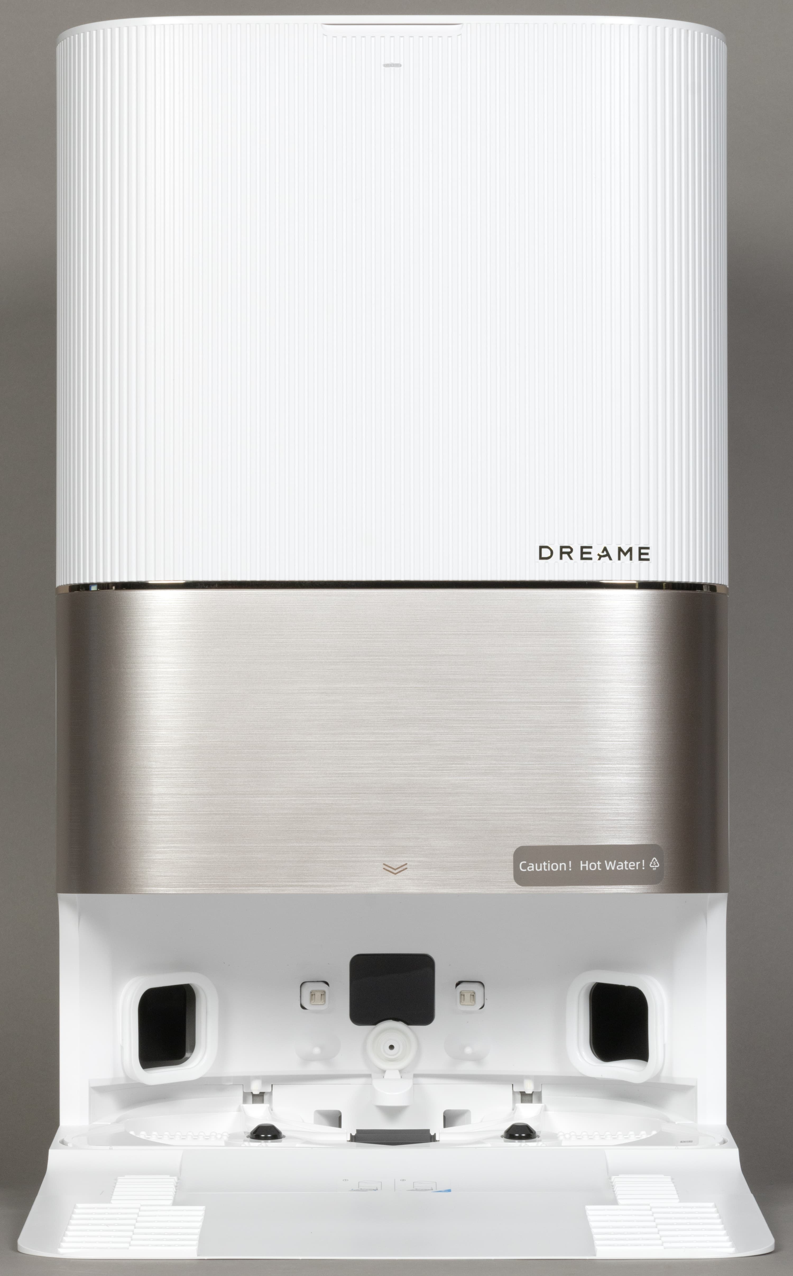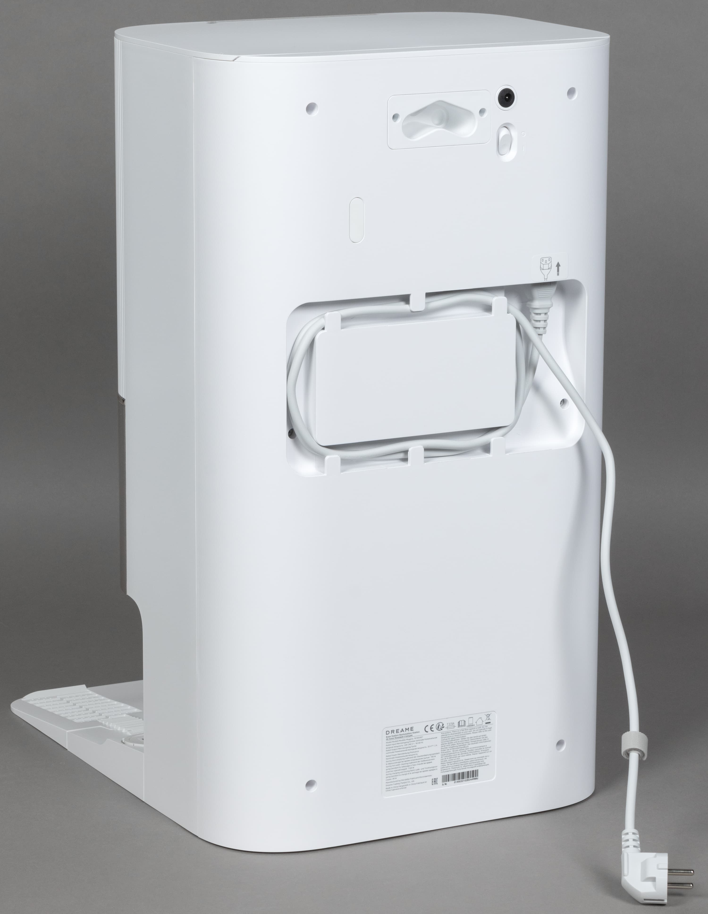 Базовая станция оборудована большой консолью для заезда робота. По центру парковочной ниши расположены контакты для зарядки, по бокам — два отверстия, через которые происходит самоочистка (сброс мусора). Между зарядными контактами — разъем автоматической дозаправки пылесоса чистой водой. Снизу — два небольших отверстия для ухода за швабрами.