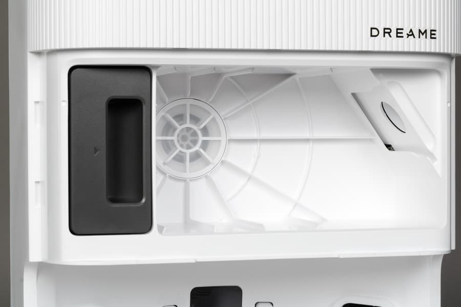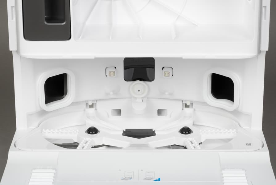 В нижней части находится система самоочистки швабр. После завершения влажной уборки швабры будут автоматически промыты, протерты о специальную пластиковую рамку, и даже просушены теплым воздухом. Сама станция способна подогревать воду для чистки салфеток до 70 градусов. Это относительно новая функция, отсутствующая во многих предыдущих моделях. Однако в топовых пылесосах мы уже такое видели.