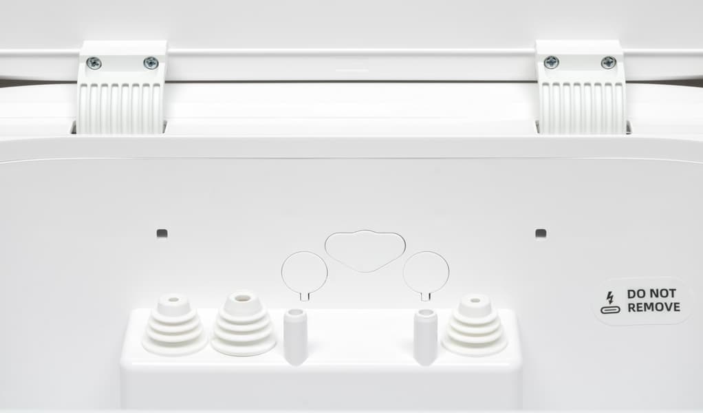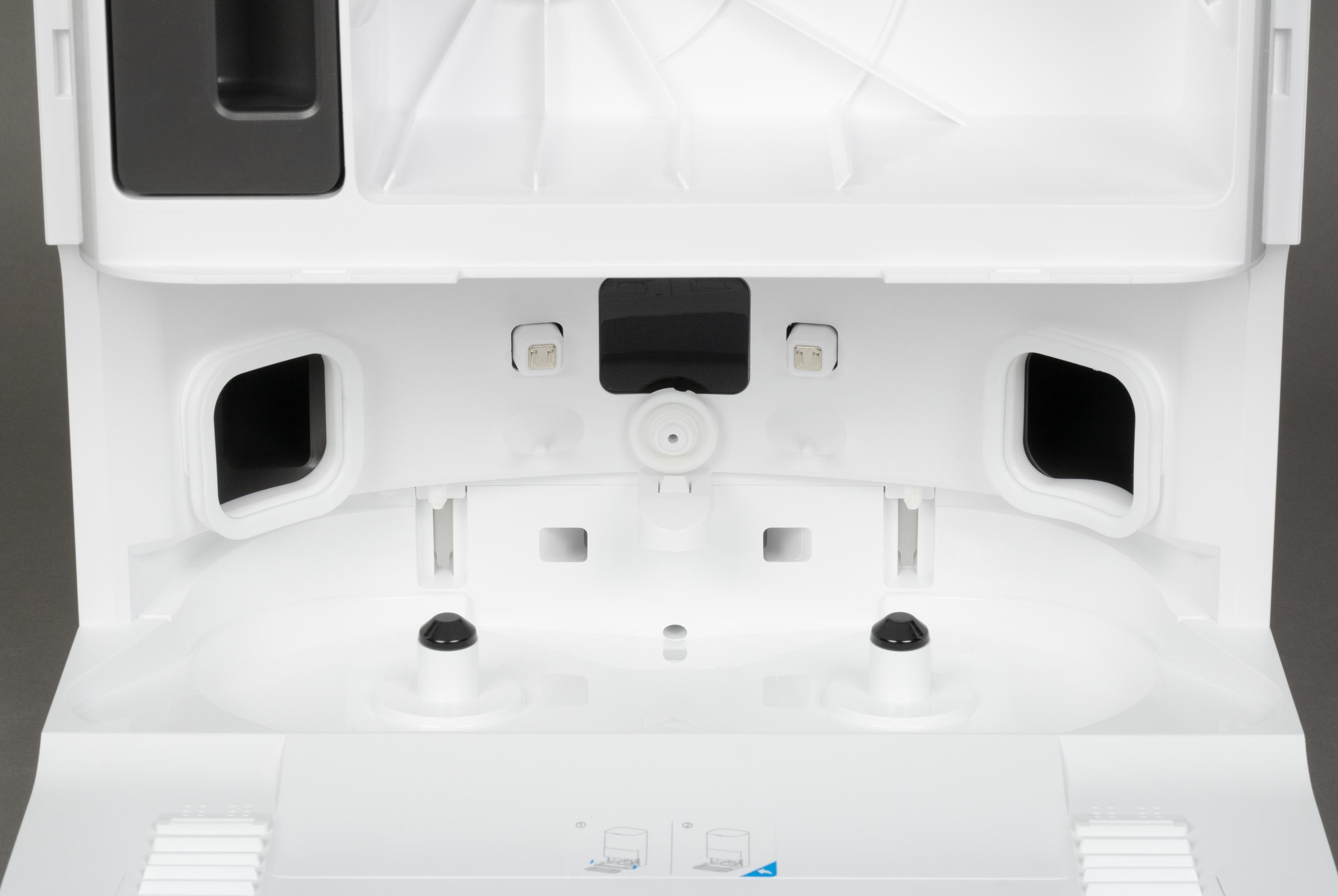 С тыльной стороны мы обращаем внимание на зарядные контакты (сверху), отверстие для автоматической дозаправки водой (по центру) и коннекторы, с помощью которых робот стыкуется с базой (справа и слева).