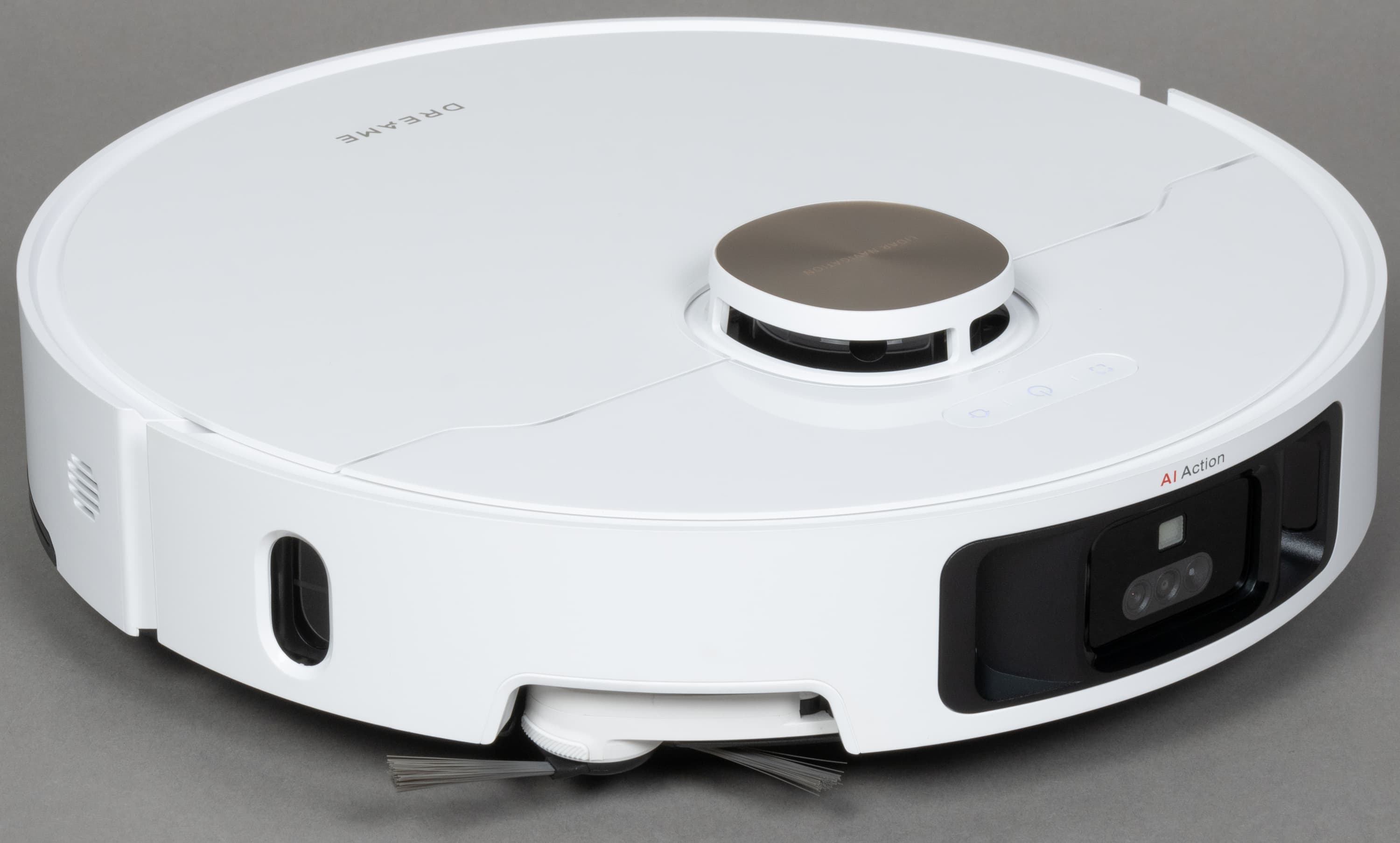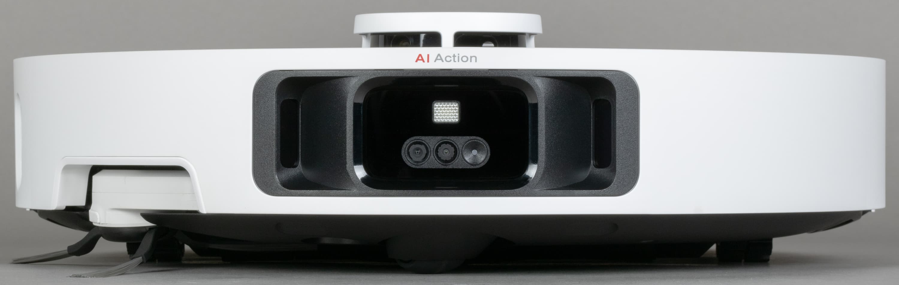 Спереди, как водится, у робота установлен подвижный бампер (он же — физический датчик столкновений). У более бюджетных моделей бампер оснащен лишь инфракрасными сенсорами, а у нашей модели между ними расположилась видеокамера, в том числе выполняющая роль интеллектуального сенсора. Традиционные сенсоры видны справа и слева от нее.