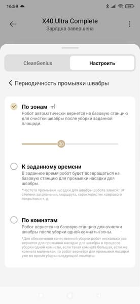Настройки базы также довольно гибкие. Нас тут в первую очередь интересует промывка швабры. Ее мы можем очищать в различных режимах. Например, через каждые 20 квадратных метров убранной площади. Или после каждой комнаты.