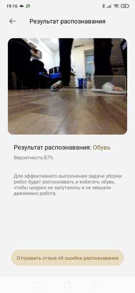 Скажем, пожалуй, пару слов про работу с камерой. Во-первых, искусственный интеллект робота позволяет распознавать препятствия. При этом мешающий объект будет сфотографирован (в кадр могут попасть и люди, так что этот режим можно отключить).