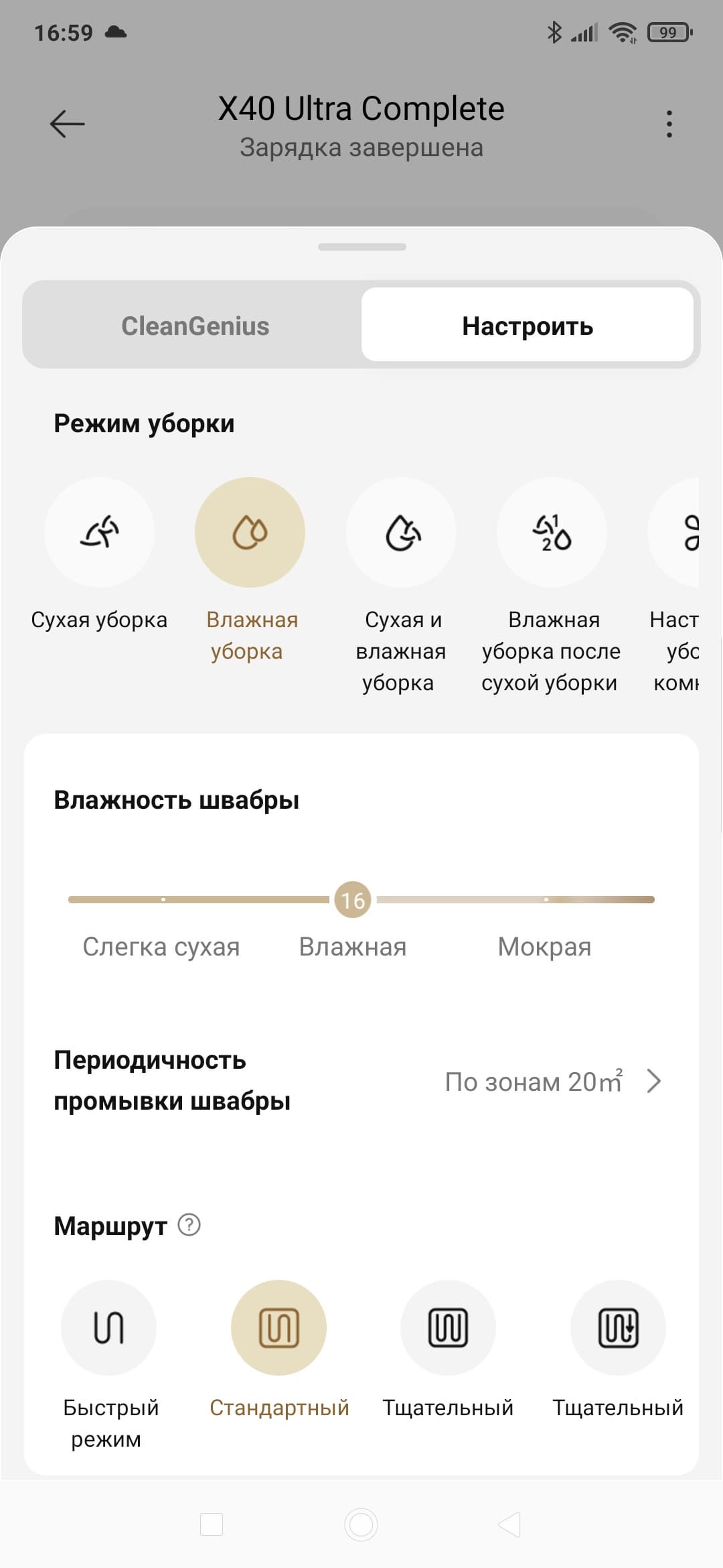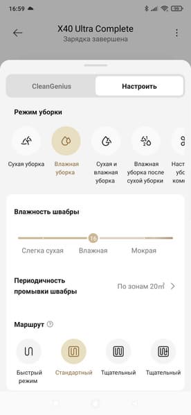 Так, для сухой уборки мы можем выбрать одну из трех мощностей всасывания (а также четвертую, самую мощную, но только на одну уборку — это пригодится при первоначальной очистке слишком загрязненного помещения). При влажной уборке мы можем настроить скорость подачи воды, периодичность промывки швабры (после уборки заданной площади/к заданному времени/после уборки каждой комнаты или зоны), а также установить маршрут — начиная от быстрого режима и заканчивая наиболее тщательным.