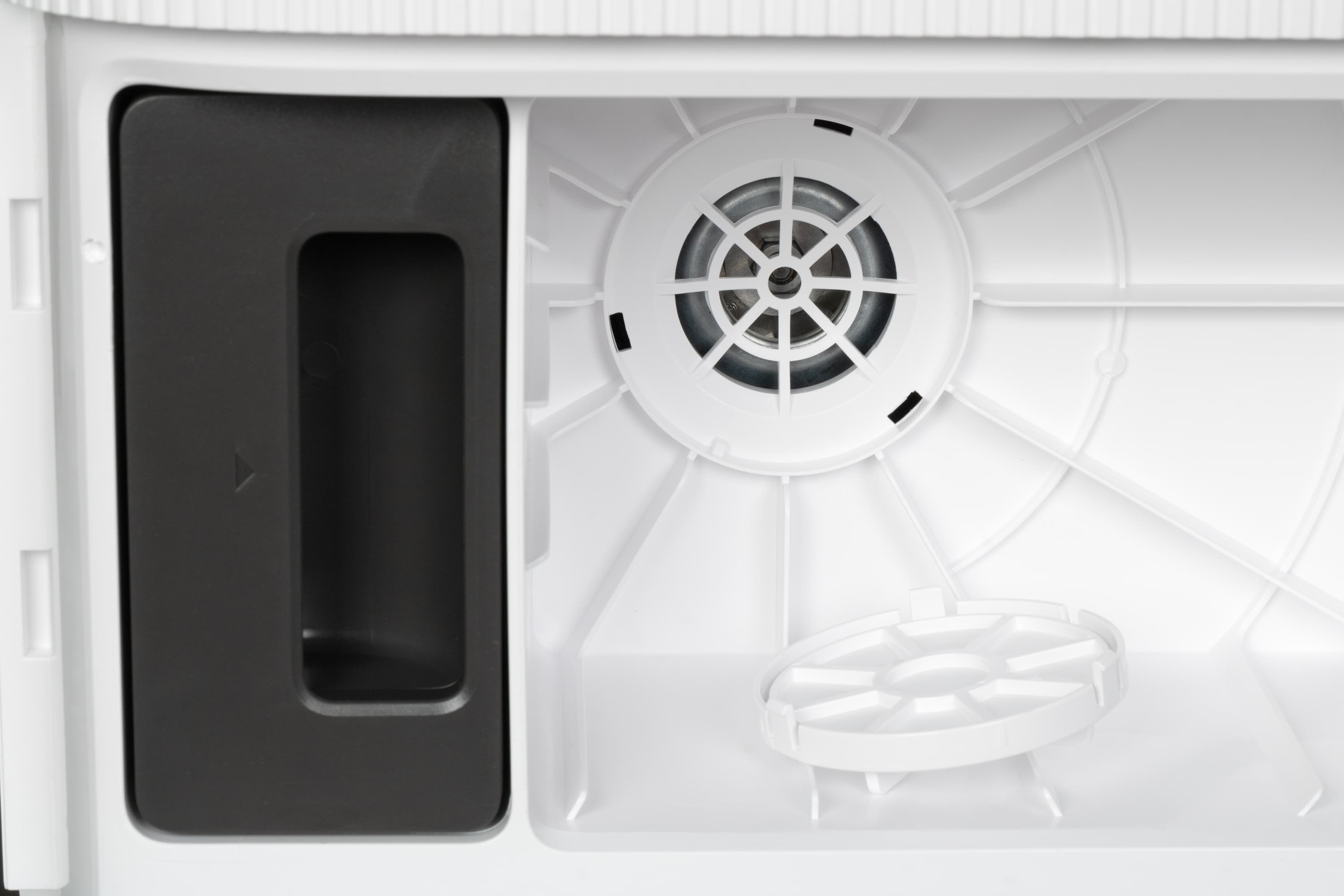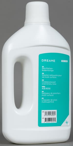В левой части отсека для сбора мусора находится контейнер для моющего средства. Чистящий раствор сюда нужно доливать по мере необходимости (хотя можно и вовсе обойтись без него).