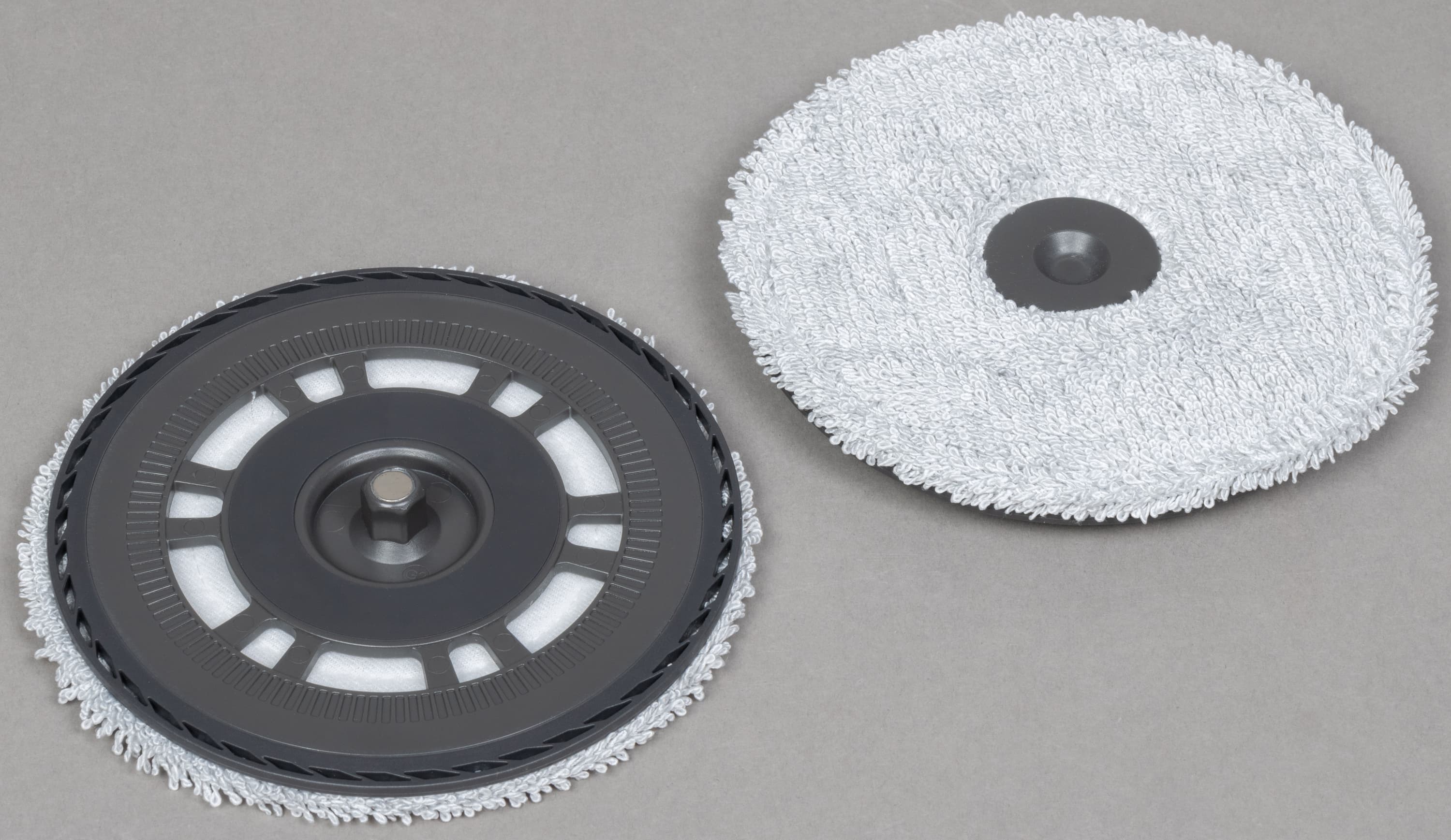 Для влажной уборки к днищу пылесоса может прикрепляться две «минишвабры» состоящих из пластиковой основы и тканевой салфетки, которая фиксируется с помощью липучки-велкро.