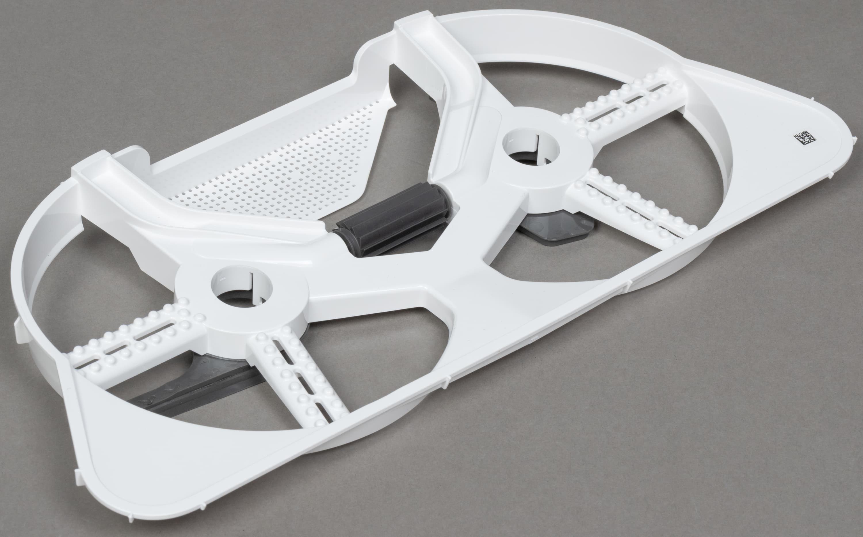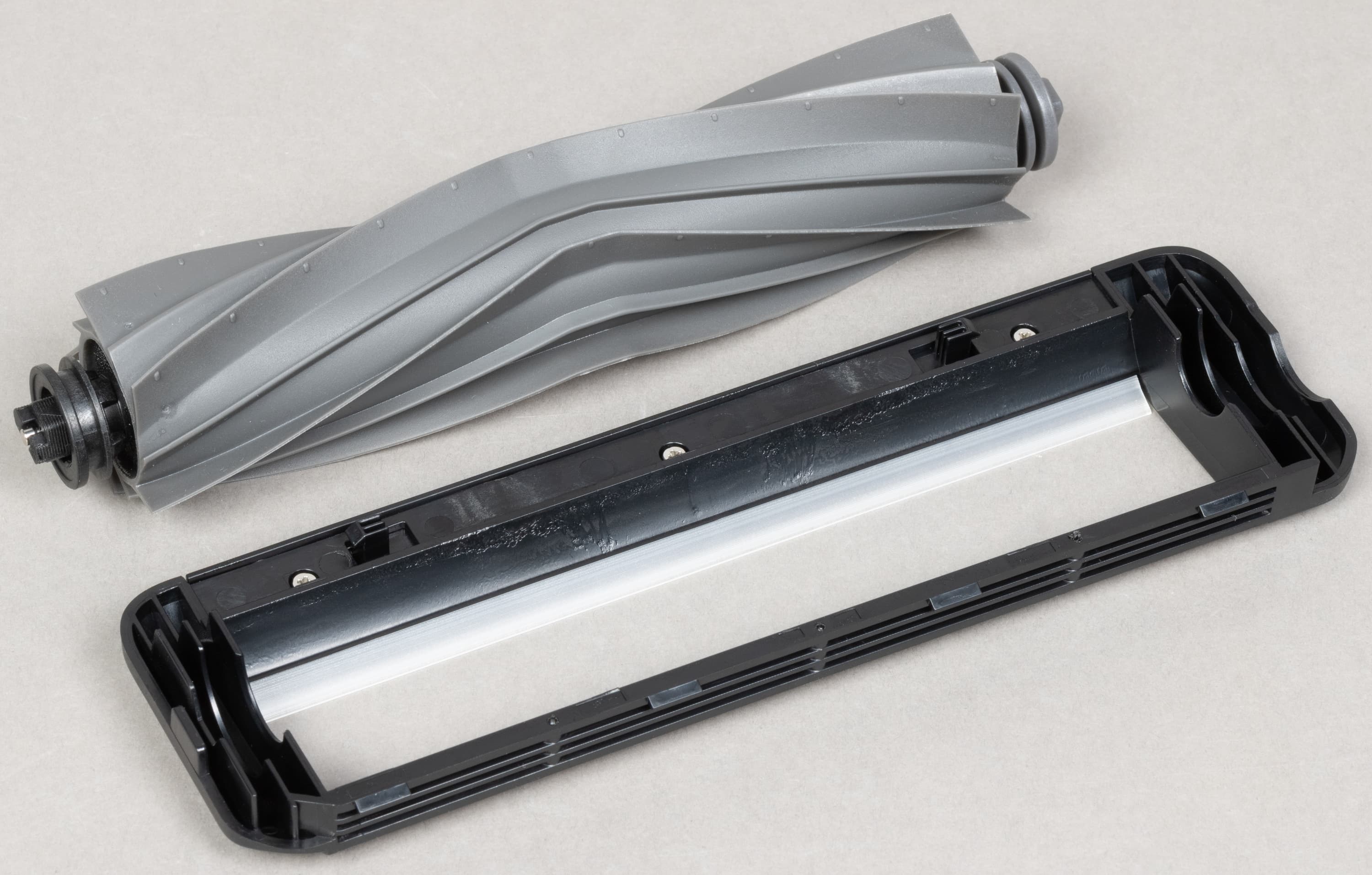 У центральной щетки нет привычных рядов щетины: только мягкие V-образные ламели в шесть рядов. Рамка крепления щетки без перемычек или каких-либо других препятствий, защищающих щетку от наматывания ниток, проводов, шнурков и тому подобных вещей.