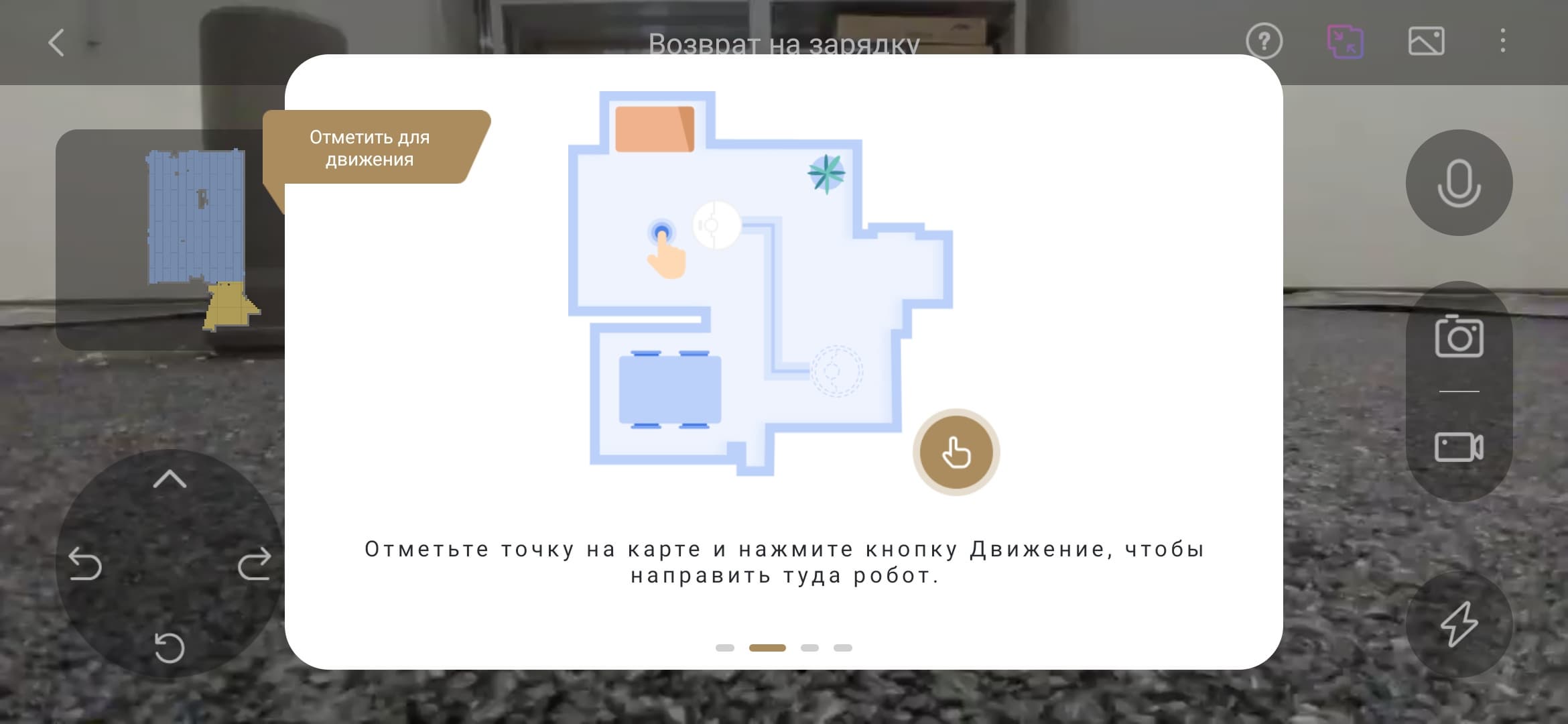 С помощью пункта «Дистанционное управление» можно превратить экран приложения в пульт ДУ, позволяющий направить робота в нужную точку квартиры. Но значительно увлекательнее делать это из главного меню, управляя пылесосом с включенной камерой.