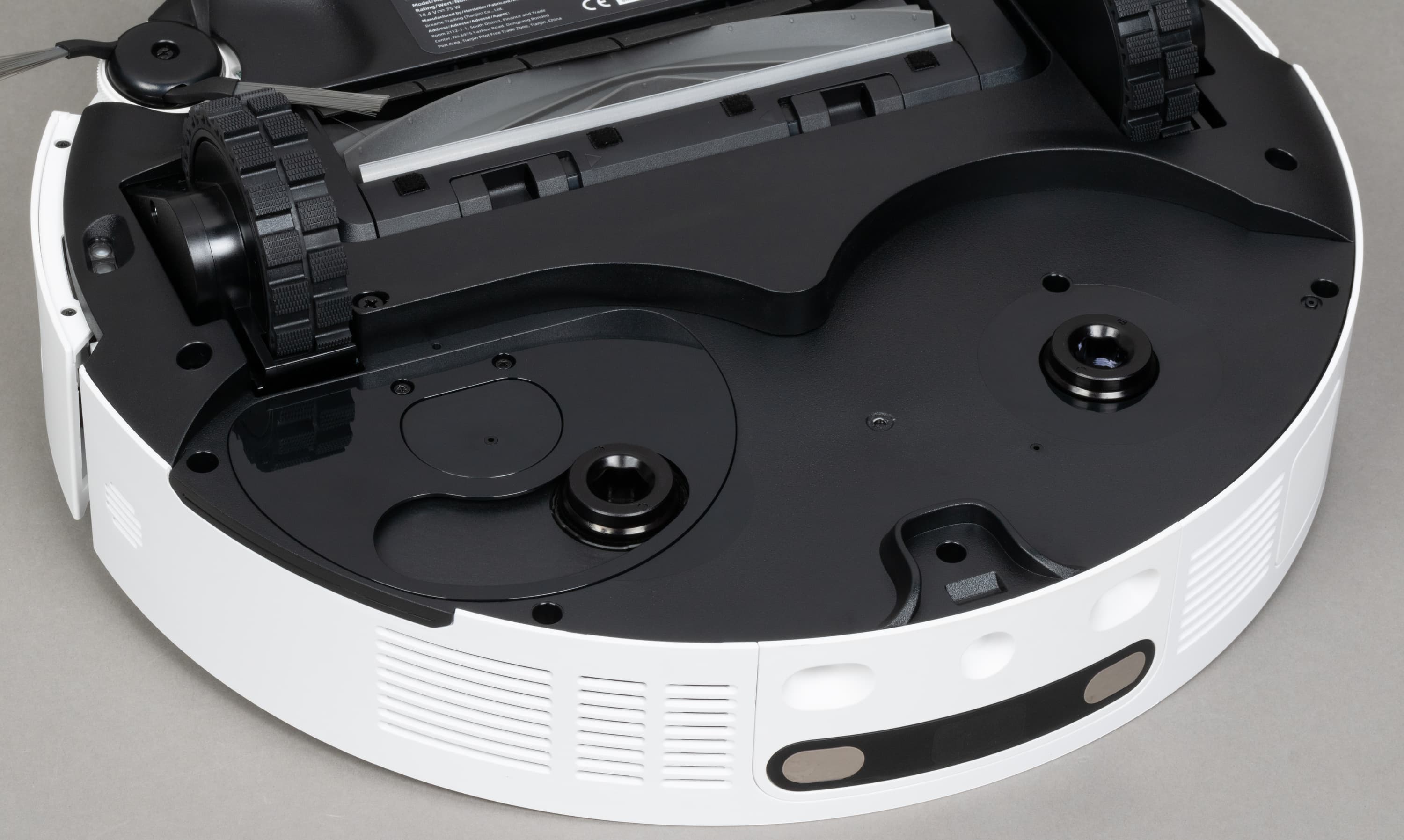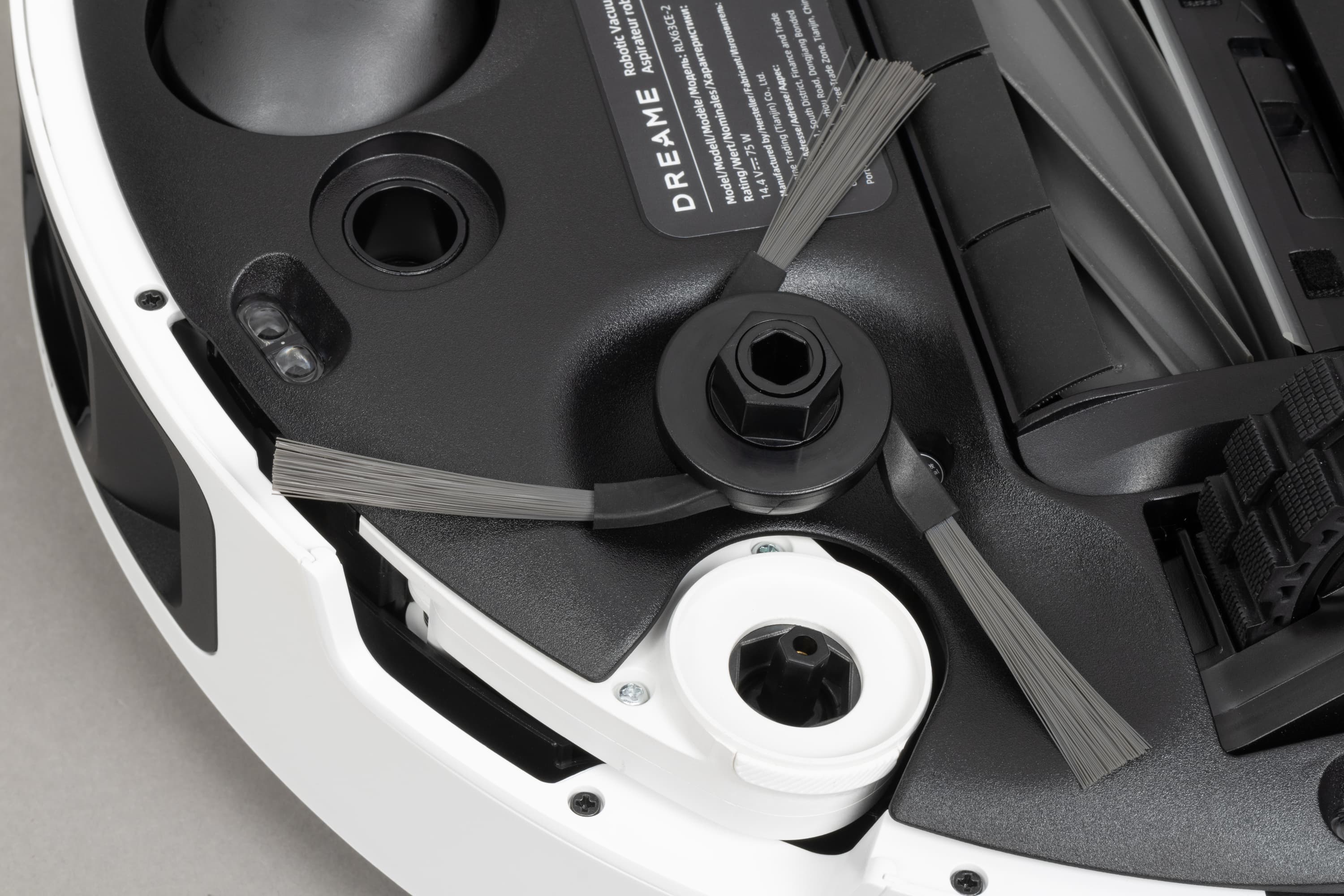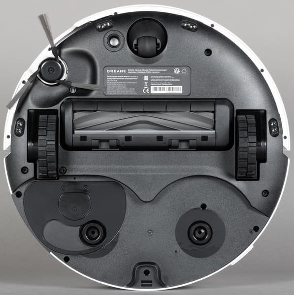 Сразу же скажем про датчики. На нижней части (спереди и по бокам) у робота есть четыре пары датчиков поверхности (с их помощью робот зафиксирует перепад высот и не упадет, например, с лестницы). Спереди, слева от ведущего колеса расположен сенсор, отвечающий за распознавание ковров.