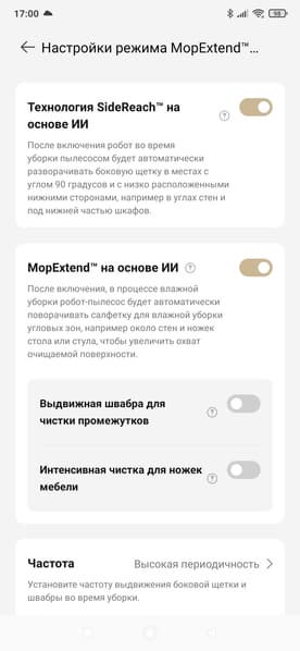 Отдельный режим настроек касается выдвижения щеток. Тут мы можем установить режимы для интенсивной очистки пространства вокруг мебельных ножек, а также включить или отключить тщательную очистку углов.