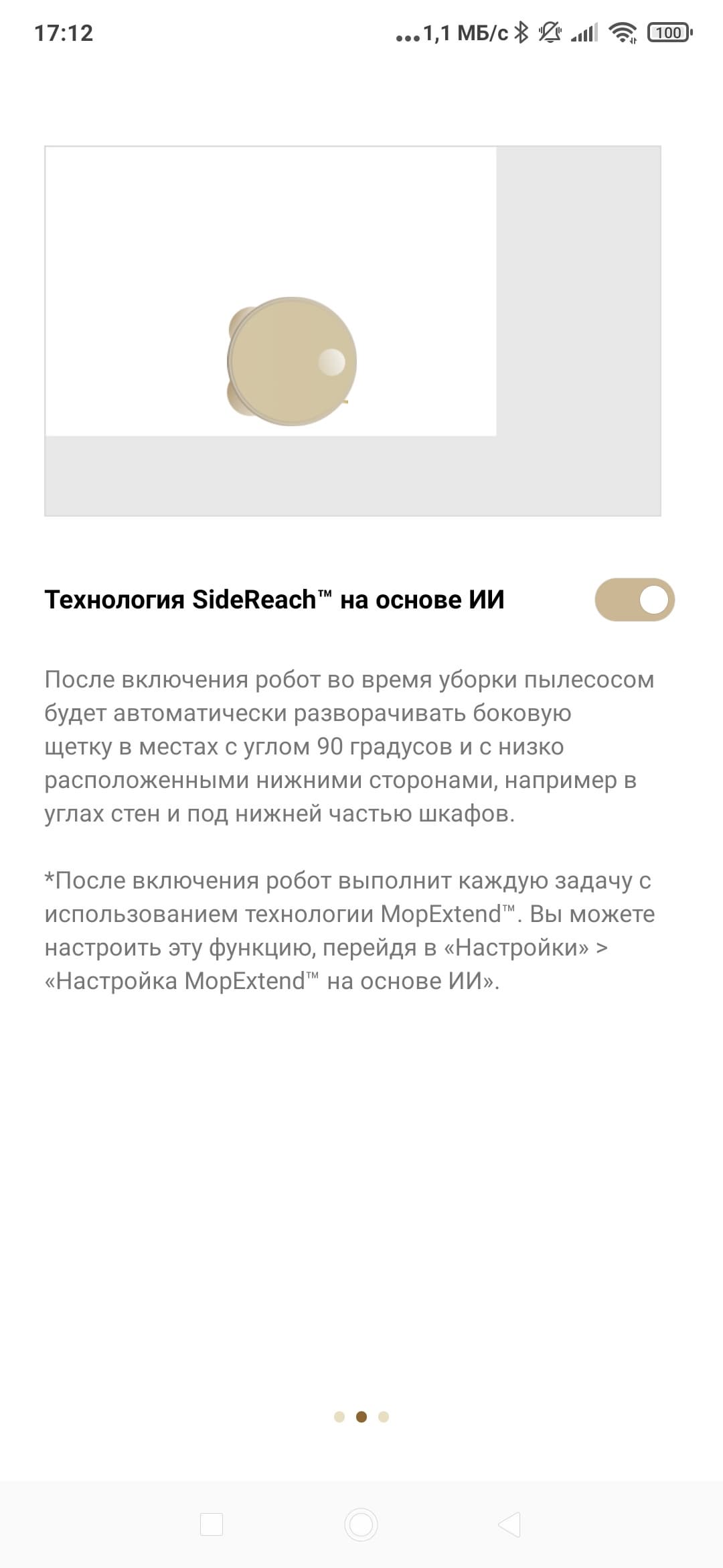 Также робот расскажет о новых режимах, связанных с выдвижными шваброй и щеткой (и, естественно, предложит их сразу же включить).