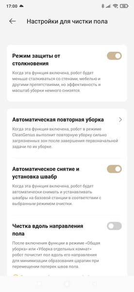 При этом функциональность приложения (в сравнении с тем, что мы видели у младших моделей) изменилась не сильно. Главное — тут добавились лишь настройки для выдвигающейся швабры и боковой щетки.