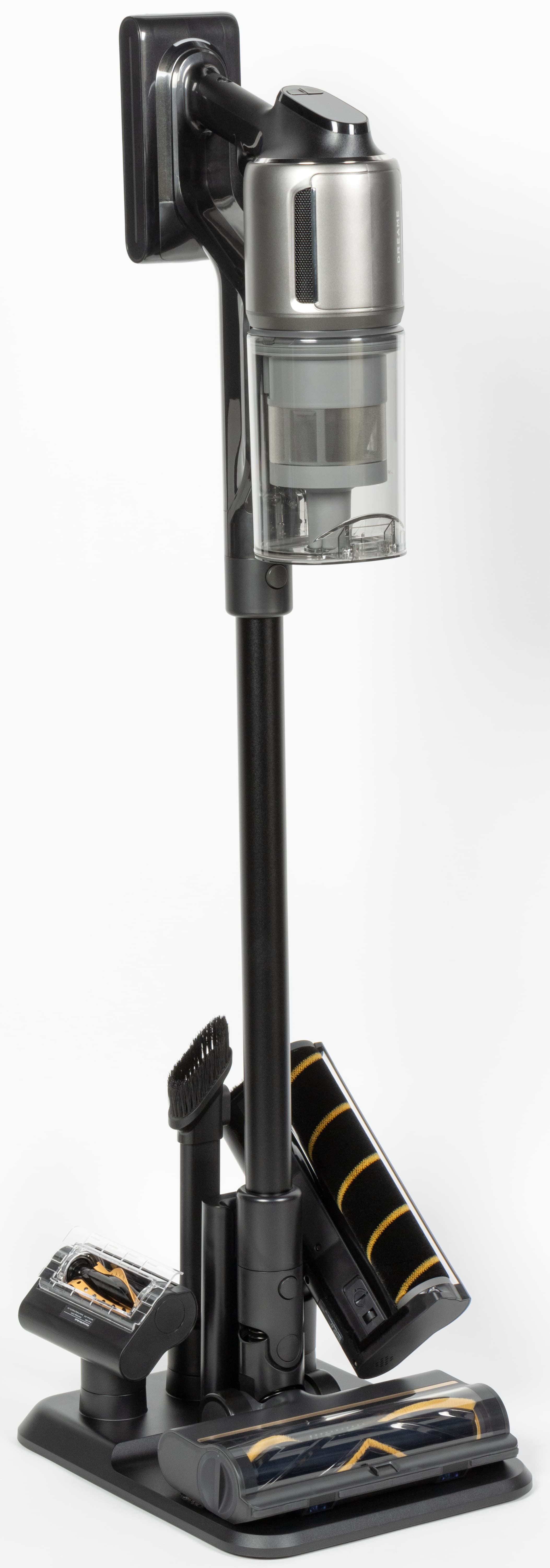 Для хранения аксессуаров для ручной уборки к устройству прилагается специальная подставка, состоящая из двух частей — основы и вертикального крепления.
