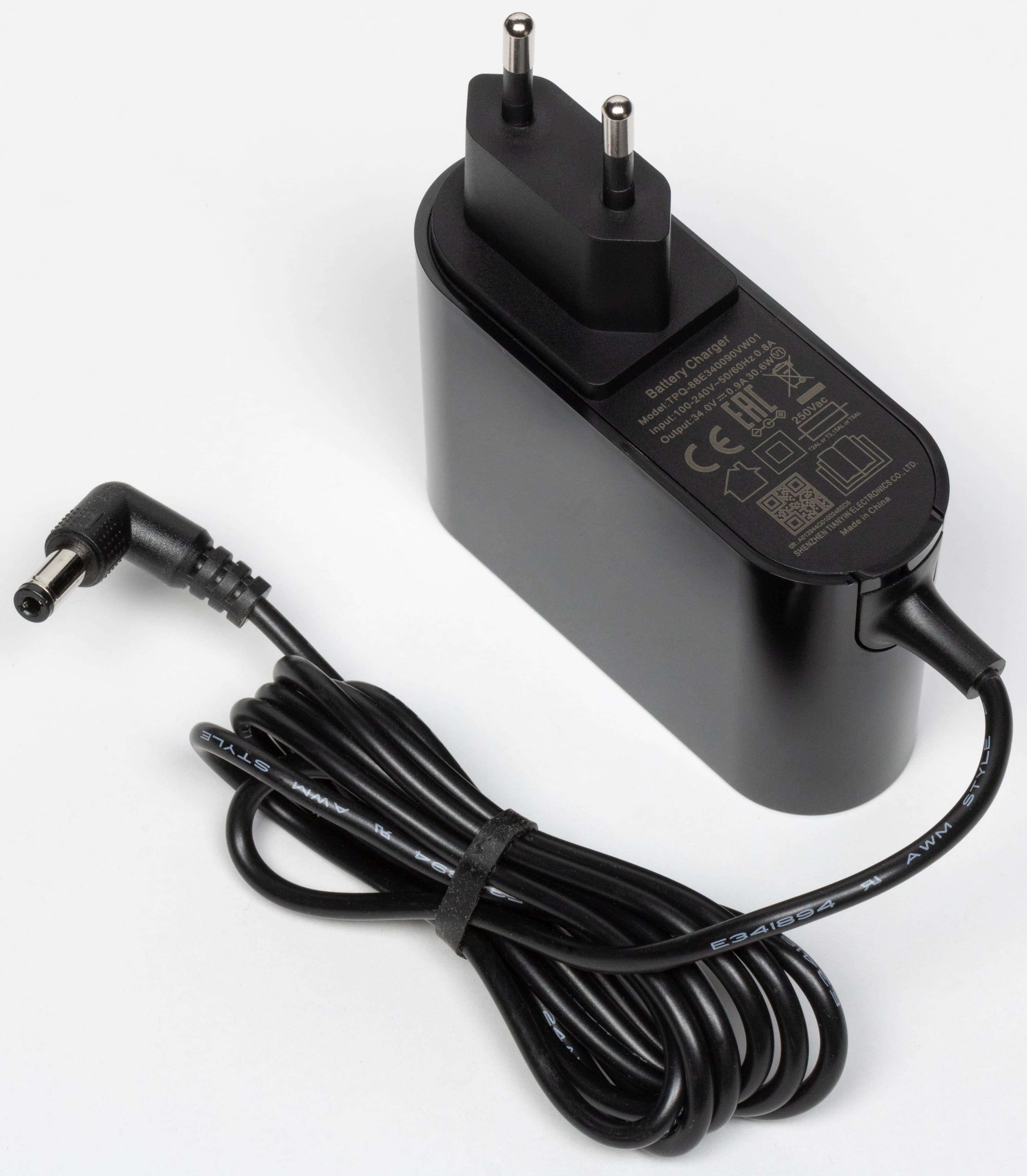 Сразу же обращаем внимание, что аккумулятор не подразумевает возможности независимой зарядки. Нам придется подключать зарядное устройство напрямую к пылесосу. Возможности повесить пылесос на настенное крепление, снабженное разъемом для подзарядки, также не предусмотрено. На наш взгляд — это ощутимый, хоть и не критичный минус.