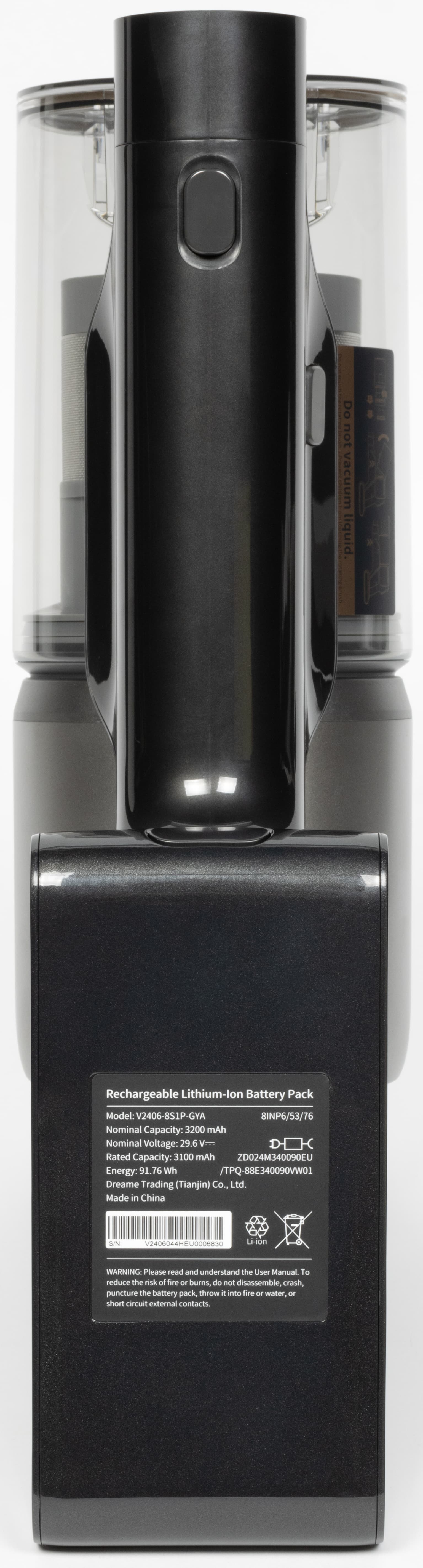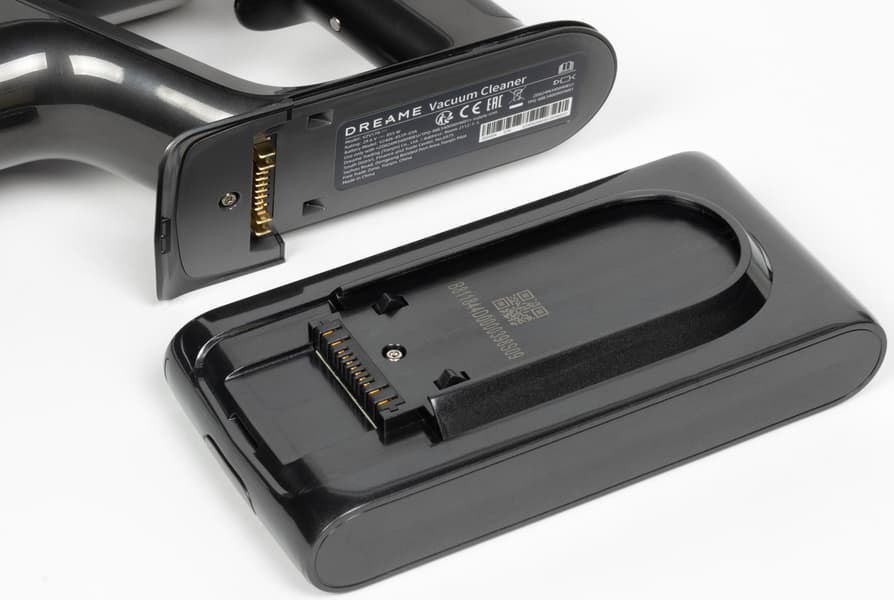 Под кнопками — разъем для подключения зарядного устройства. Съемный аккумулятор подключается к пылесосу 11-контактным разъемом и удерживается на месте четко работающей защелкой. Чтобы освободить батарею, следует нажать кнопку на ее передней стороне.