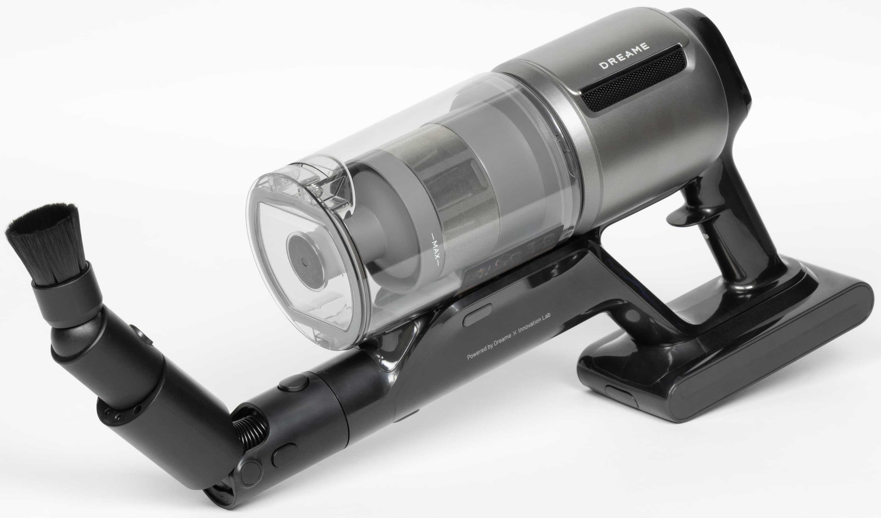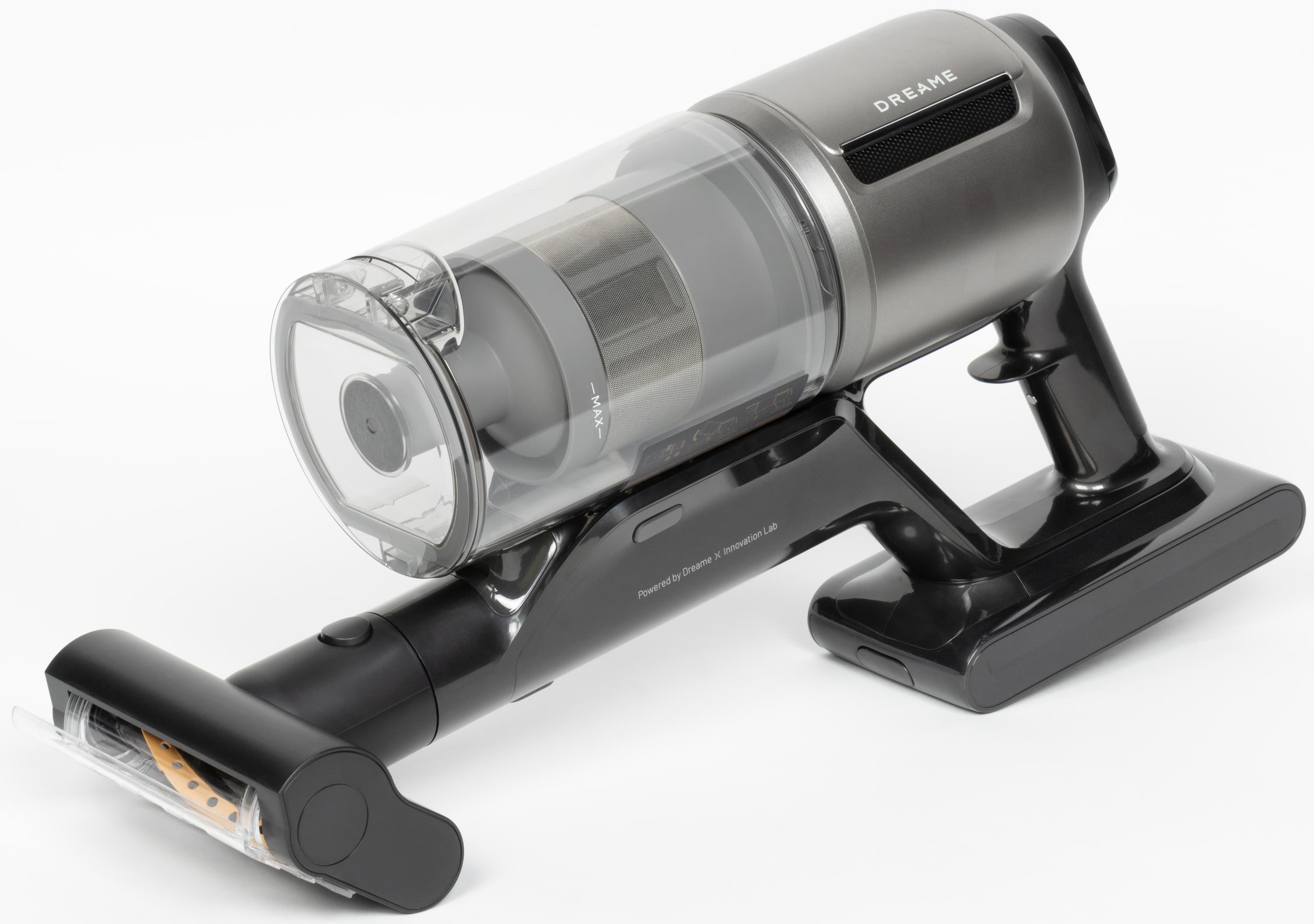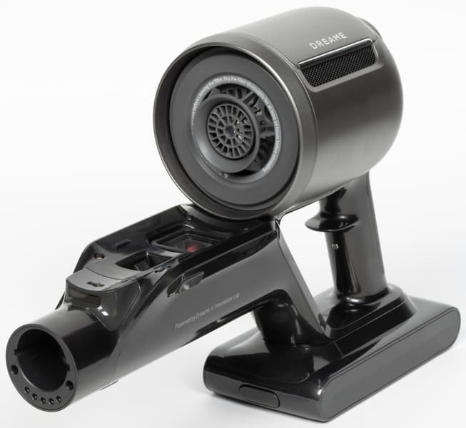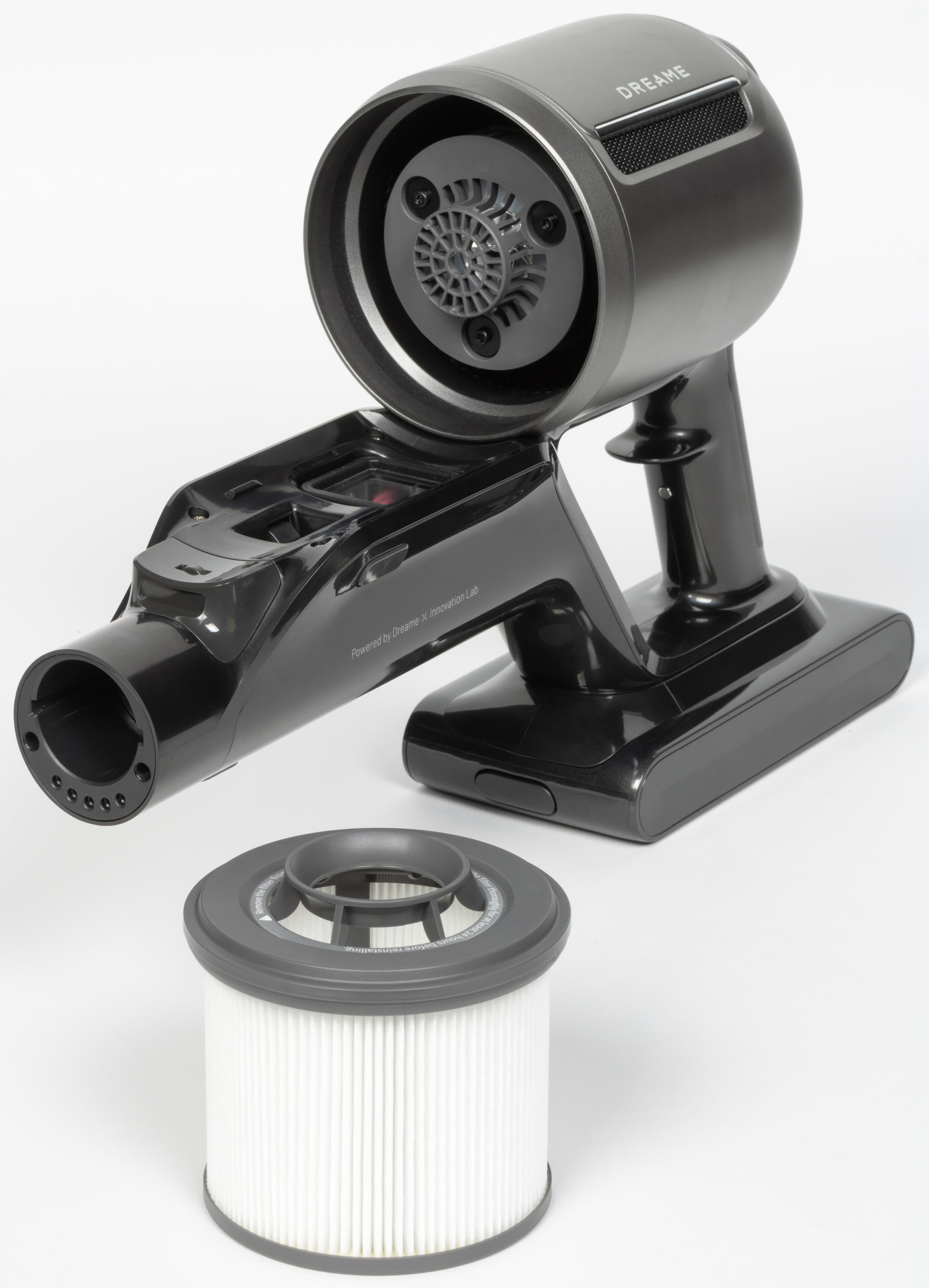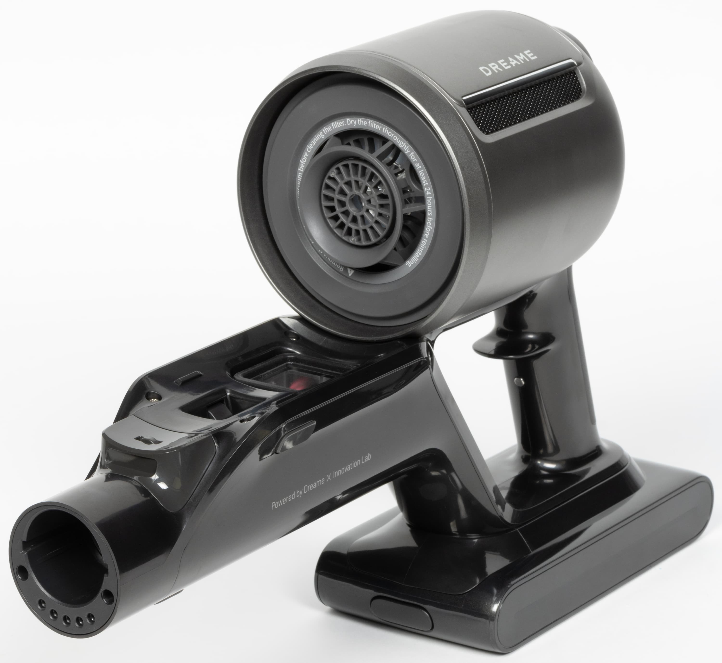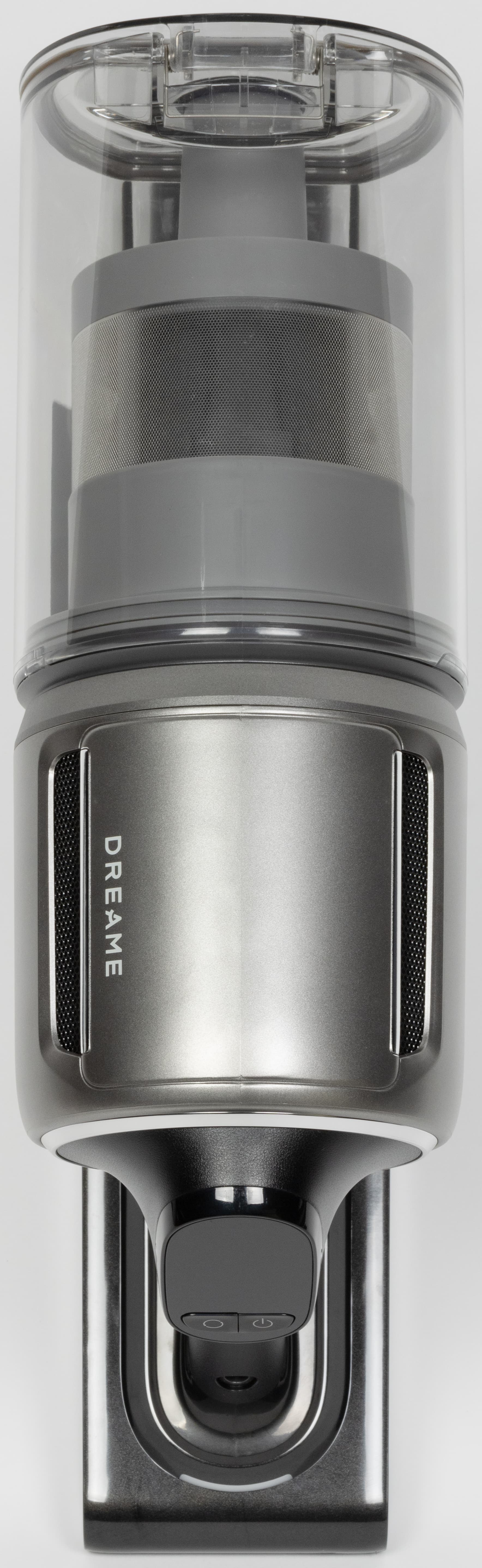 Компоновка пылесоса традиционная для устройств Dreame. Пылесос сделан по продольной схеме: цилиндрический корпус мусоросборника с циклонным фильтром размещен параллельно воздушному тракту. В точке соединения с контейнером поток воздуха с пылью и мусором разворачивается на 180° и закручивается вокруг циклона.