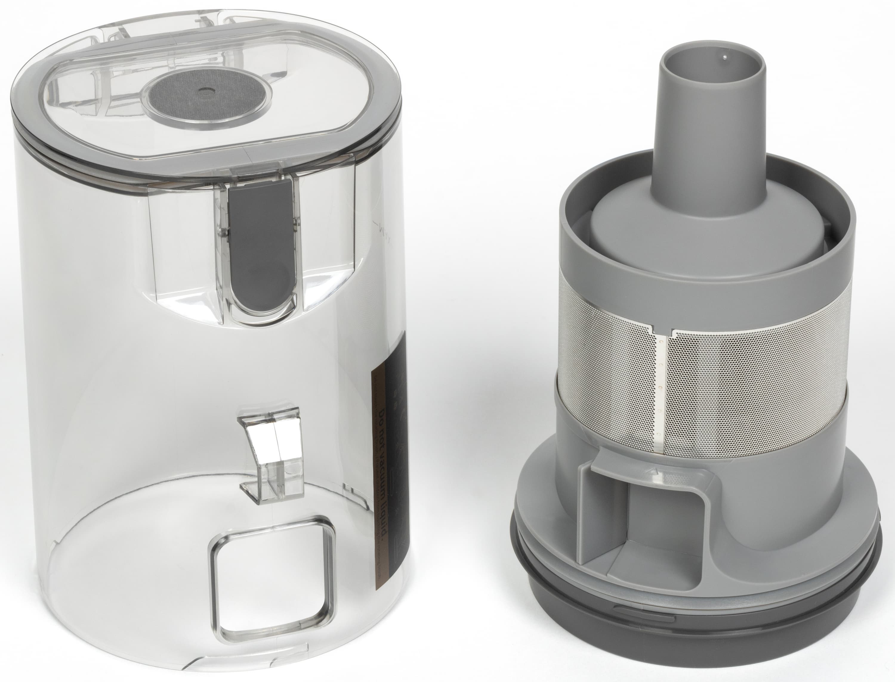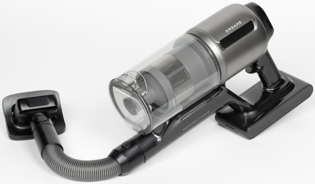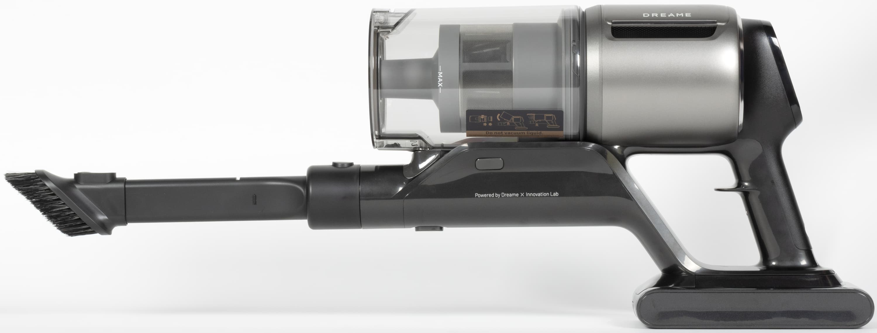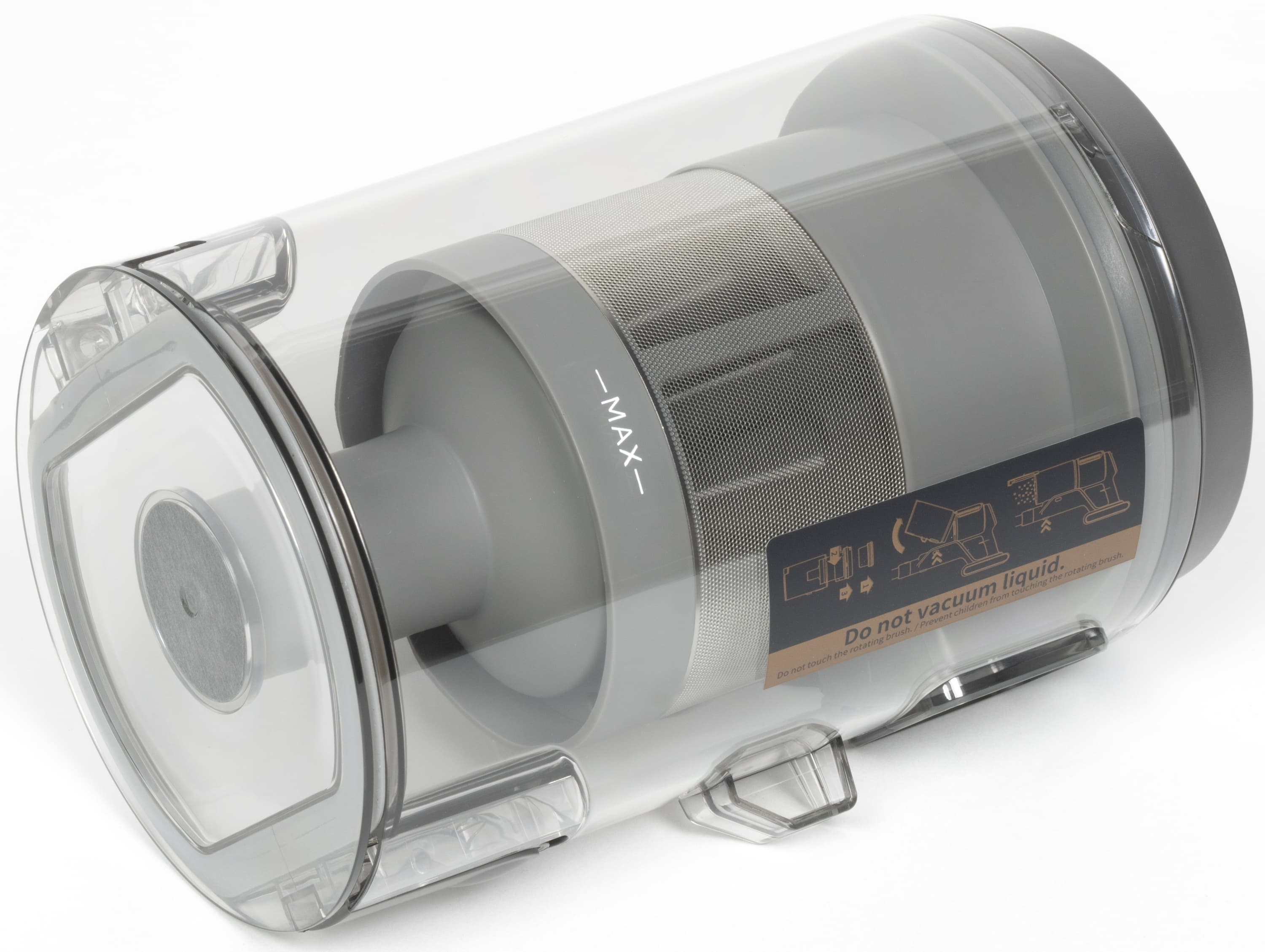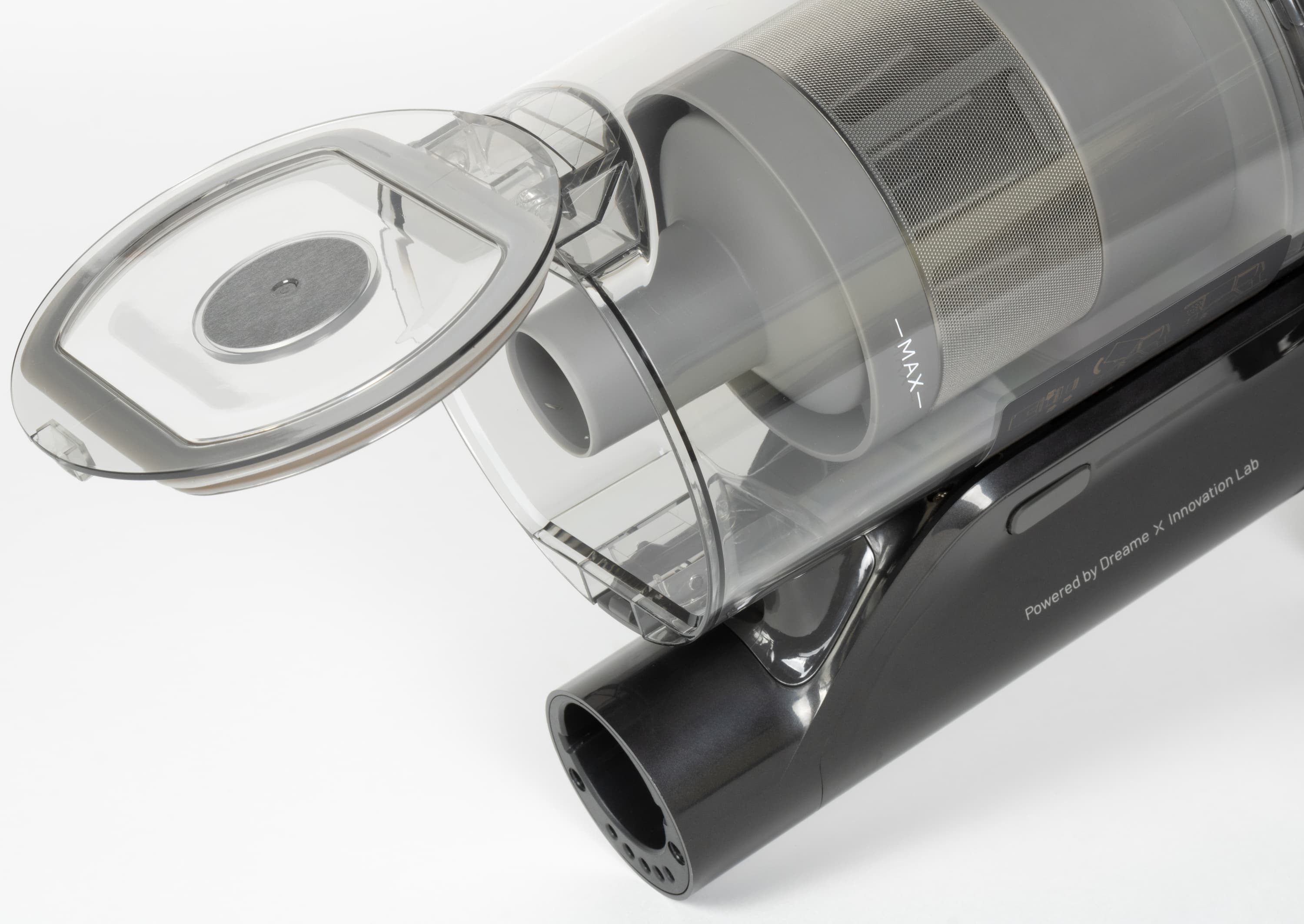 Компоновка пылесоса традиционная для устройств Dreame. Пылесос сделан по продольной схеме: цилиндрический корпус мусоросборника с циклонным фильтром размещен параллельно воздушному тракту. В точке соединения с контейнером поток воздуха с пылью и мусором разворачивается на 180° и закручивается вокруг циклона.