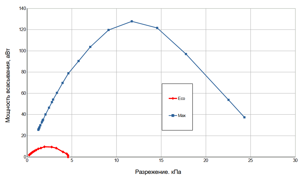 Мощность всасывания (что это такое и как ее измеряем, описано в отдельной статье) мы определяли при работе пылесоса без трубы и насадок, в обоих режимах. Зависимость мощности всасывания от создаваемого разрежения приведена на графике ниже: