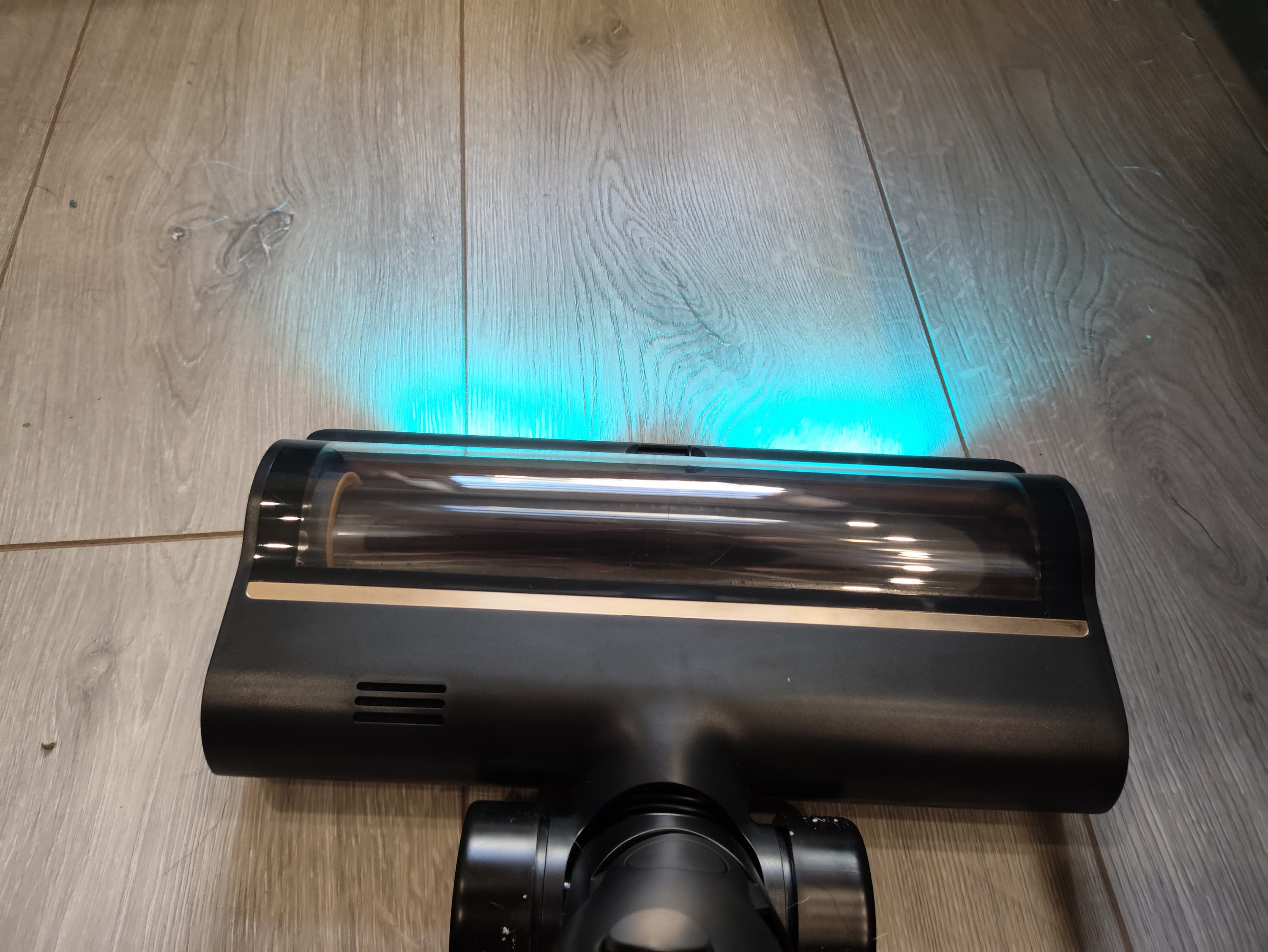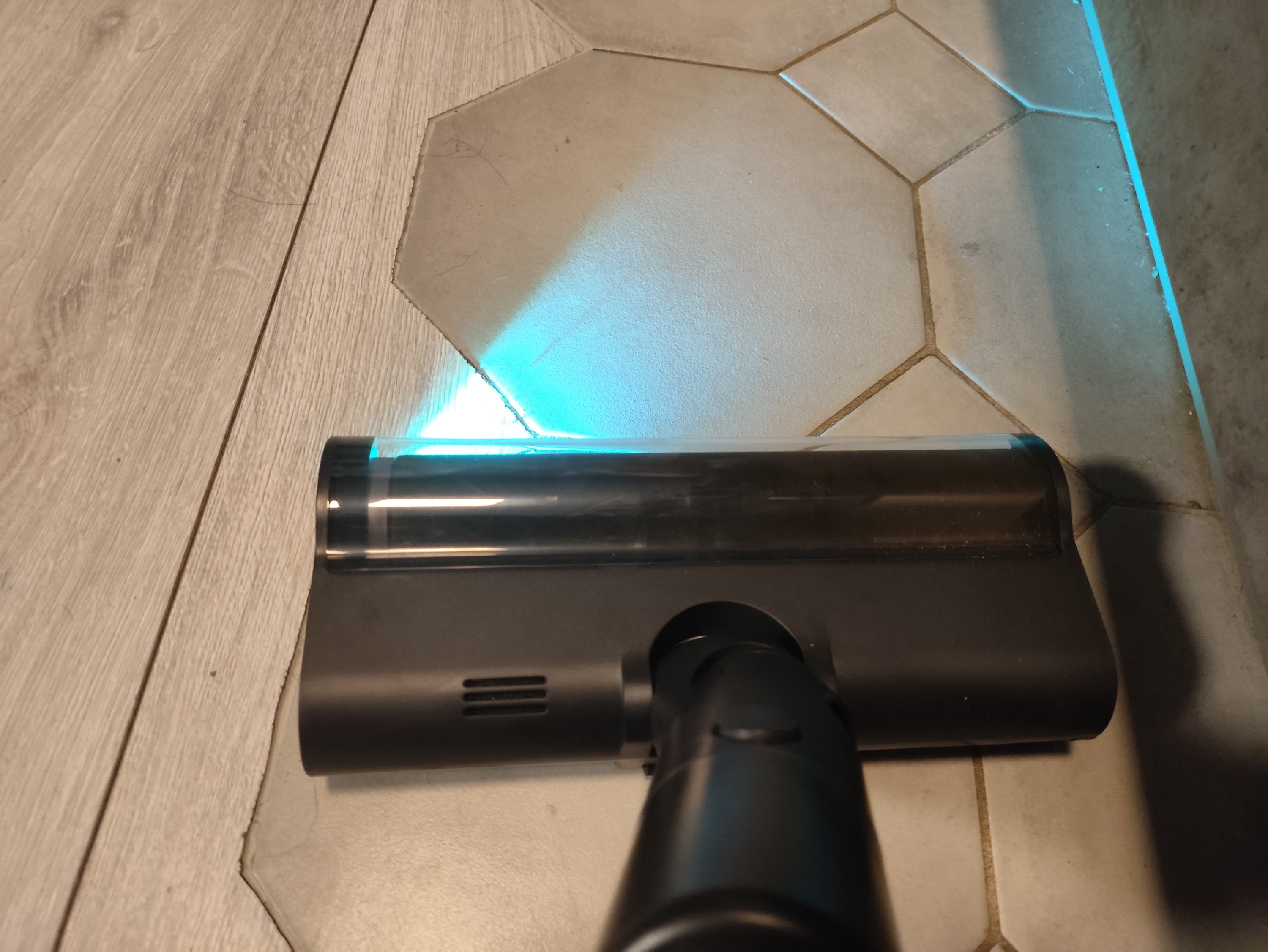 А вот как выглядит подсветка у второй насадки (с мягким валиком). Свет тут боковой и, признаться, мы не слишком хорошо уяснили, почему в одном случае нужно светить вперед, а в другом — слева направо. К тому же, такое расположение подсветки накладывает некоторые ограничения на порядок уборки. Мы будем вынуждены поворачиваться нужной стороной чтобы подсветить интересующий нас участок.