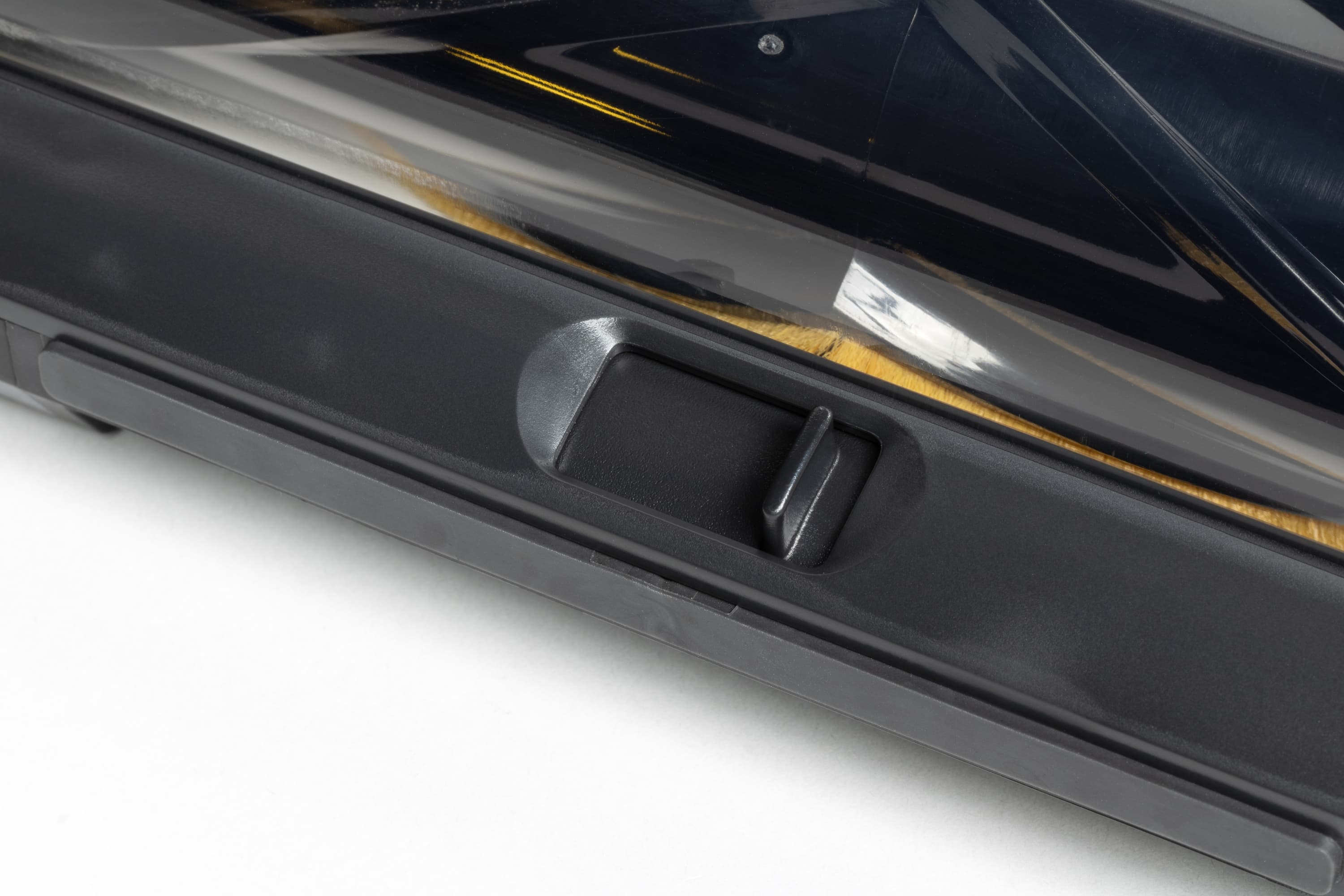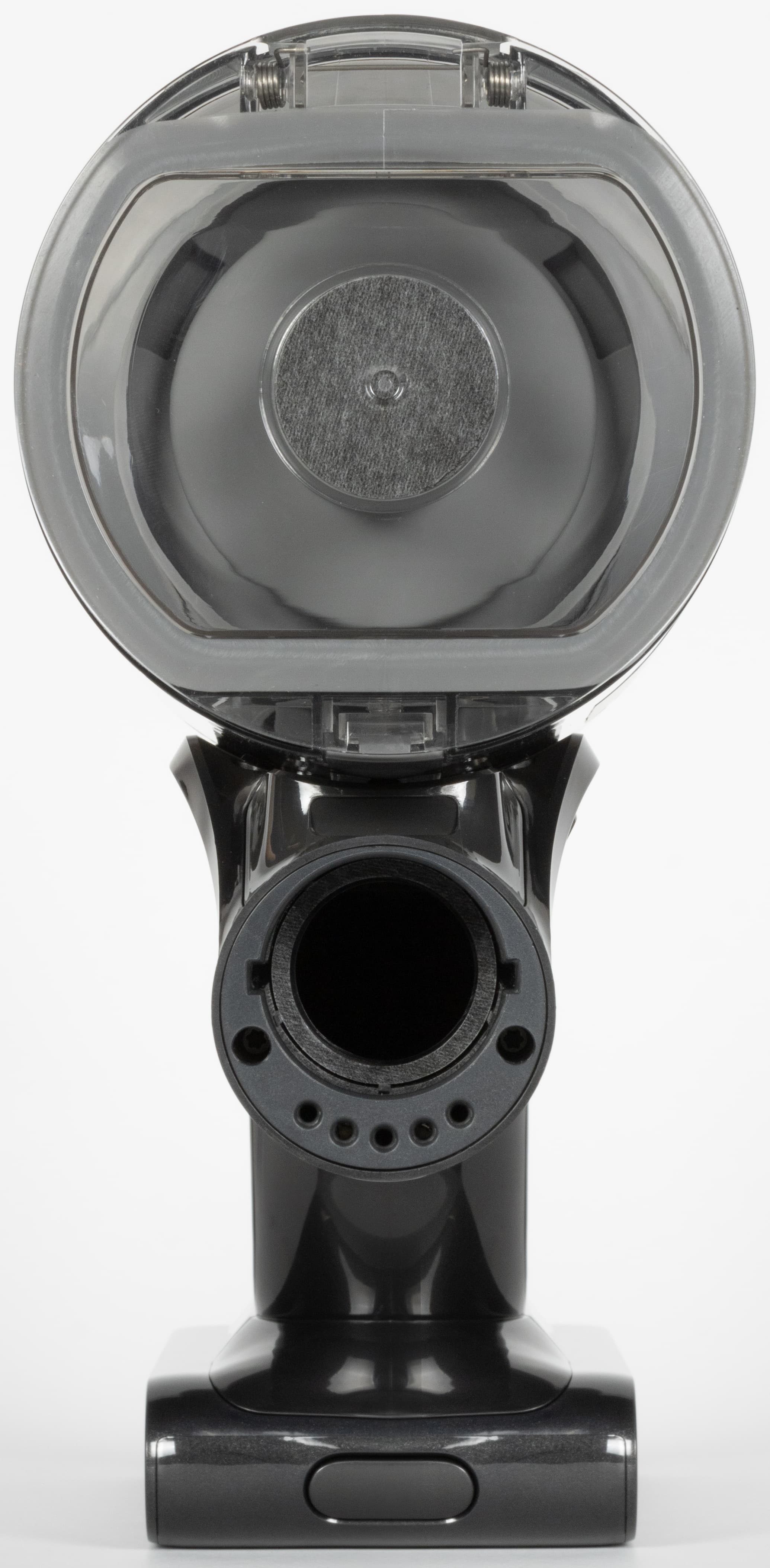 Подпружиненная крышка автоматически открывается при нажатии на кнопку, расположенную на боковой стороне контейнера. Именно на нее передает нажатие кнопка на корпусе пылесоса. Таким образом, опорожнить контейнер мы можем как отдельно, так и не снимая его с моторного блока.