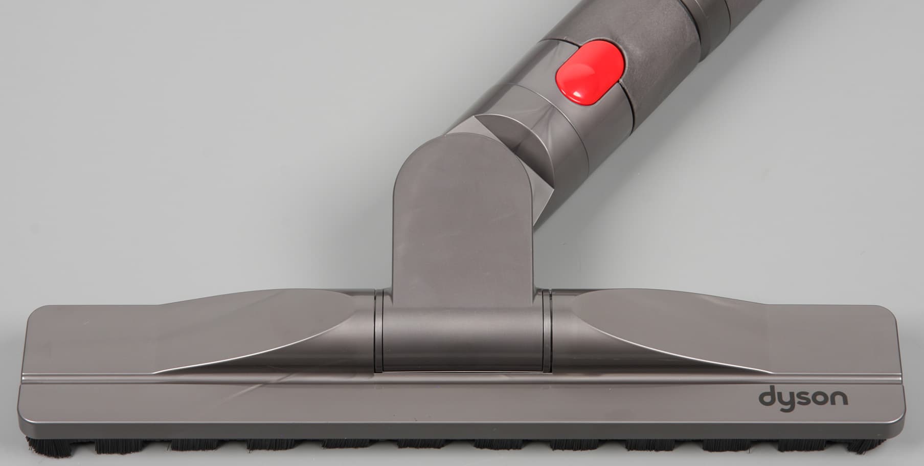 Насадка имеет два вертикальных шарнира с суммарным отклонением порядка 70 градусов и шарнир обеспечивающий свободное вращение по продольной оси. Снизу есть обрамление из упругих пластиковых скребков и полосок с коротким ворсом. В скребках присутствуют вырезы для захвата крупного мусора, а выемки по бокам позволяют засасывать мусор непосредственно от поверхностей стен. Скользить щетке по полу помогают восемь небольших роликов и колеса-крышки на шарнире. Центральная серая часть насадки перемещается вверх-вниз, сильнее или слабее прижимаясь к полу. На ковровых покрытиях прижим сильнее, воздух прокачивается через ворс ковра, очищая его от мусора. На гладких покрытиях прижим слабее, что бы щетку легче было перемещать по полу, и сохранялся необходимый для захвата мусора поток воздуха. Тип покрытия распознается с помощью красного флажка в задней части насадки, который отклоняется ворсом ковра и остается перпендикулярным полу на гладких поверхностях. Дополнительно пользователь может увеличить силу прижима, переведя движок сверху насадки в положение Max.