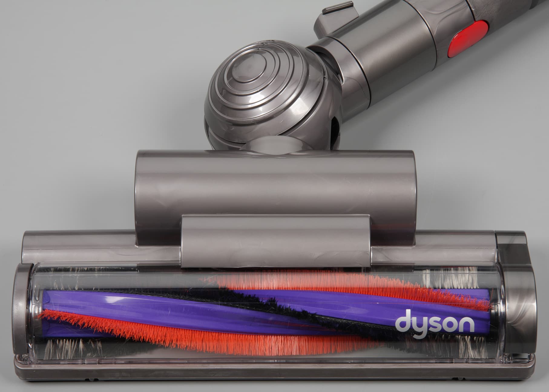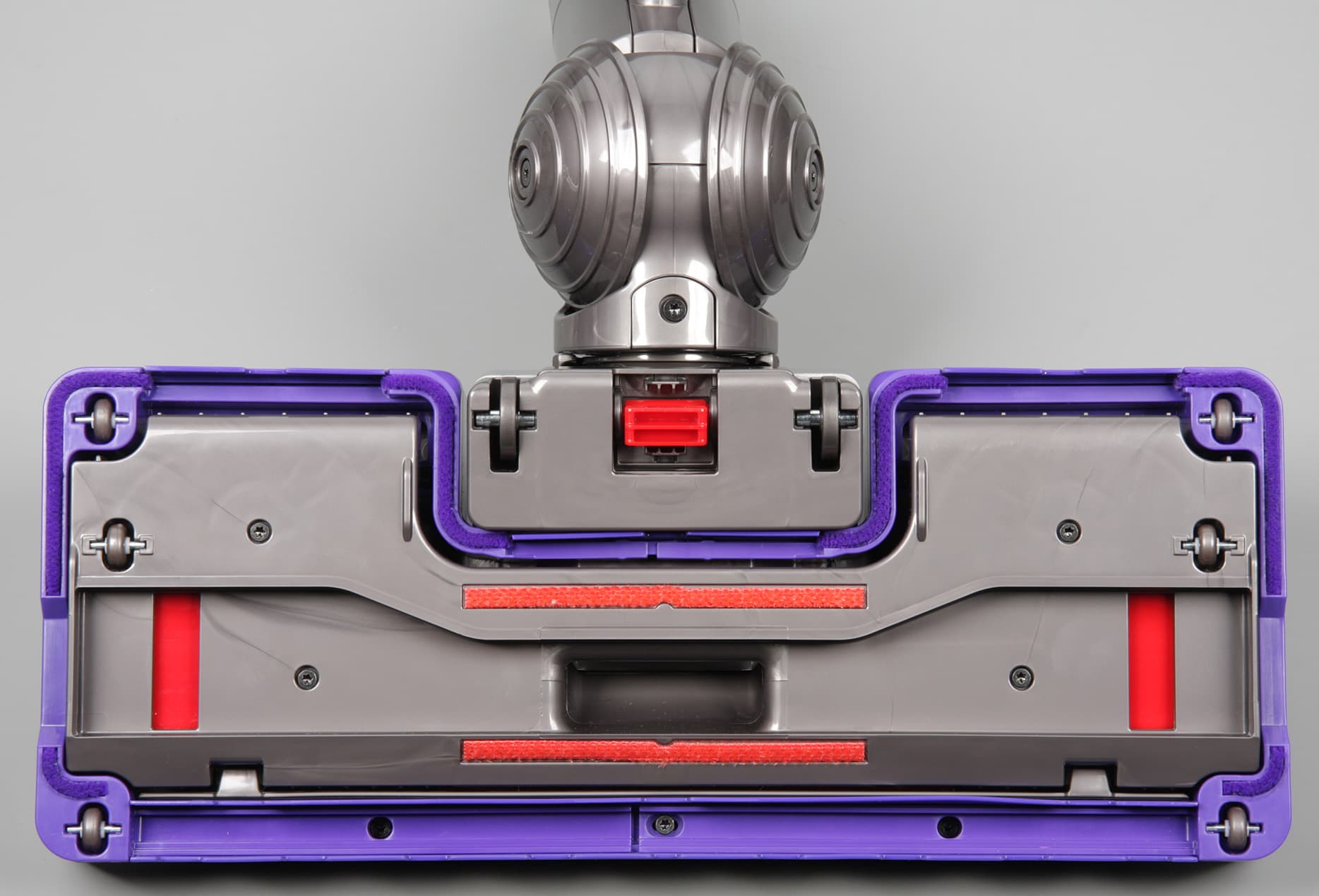 Вращение от турбинки через редуктор передается на щетку. Воздух для вращения турбинки забирается отдельно от основного потока через сетчатый фильтр сбоку на корпусе насадки. Щетка имеет четыре ряда щетинок. При этом черные ряды сформированы из мягких щетинок из углеродного волокна, хорошо сохраняющего форму, а красные — из нейлоновых щетинок потолще и пожестче. При работе прозрачный колпак позволяет определить, вращается ли щетка, а в перерывах видно, сколько и чего на щетку намоталось и не пора ли ее почистить. Насадка оснащена шарниром с двумя степенями свободы — отклонение по вертикали примерно на 60° и свободное вращение вдоль трубы. Кожух насадки может немного отклоняться относительно корпуса, что помогает сохранять плотный контакт с полом при перемещении насадки. Эту щетку можно подсовывать под протяженные предметы обстановки с просветом где-то 82 мм. При ширине насадки в 266 мм рабочая ширина составляет 227 мм (по длине щетины на щетке). На корпус насадки наклеена велюровая полоска, предохраняющая поверхность пола от царапин, а спереди есть упругая накладка, образующая предохранительный для мебели бампер. Скользить щетке по полу помогают четыре небольших ролика и колеса-крышки на шарнире. Покрышки роликов и сами колеса изготовлены из упругого пластика.