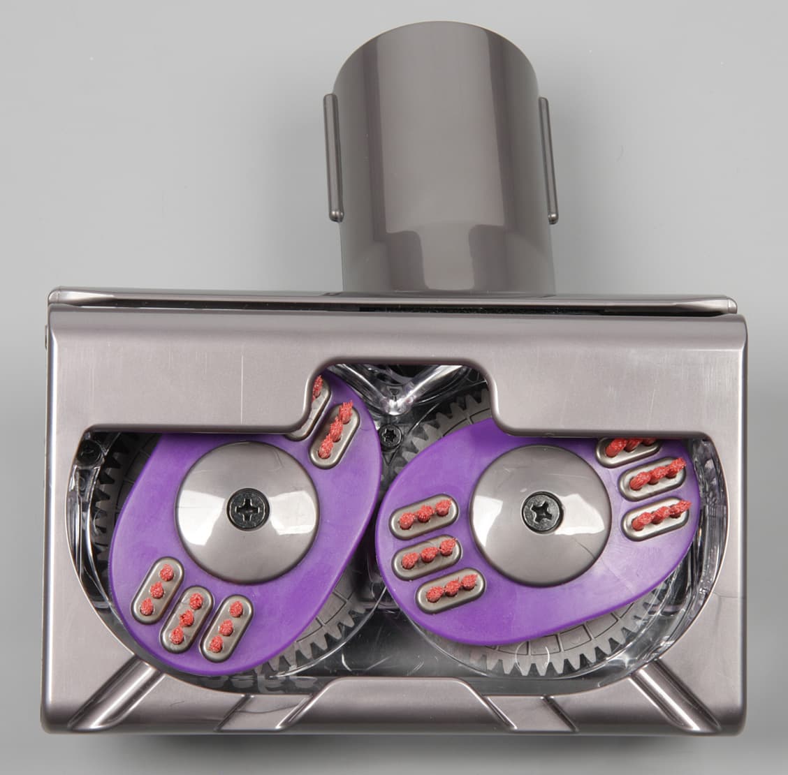 Насадка оснащена двумя встречно вращающимися щетками, оси которых ориентированы перпендикулярно полу. На упругих овальных пластинах щеток закреплены пучки нейлоновых щетинок. Отсутствие валика по замыслу разработчиков исключает наматывание волос и шерсти.