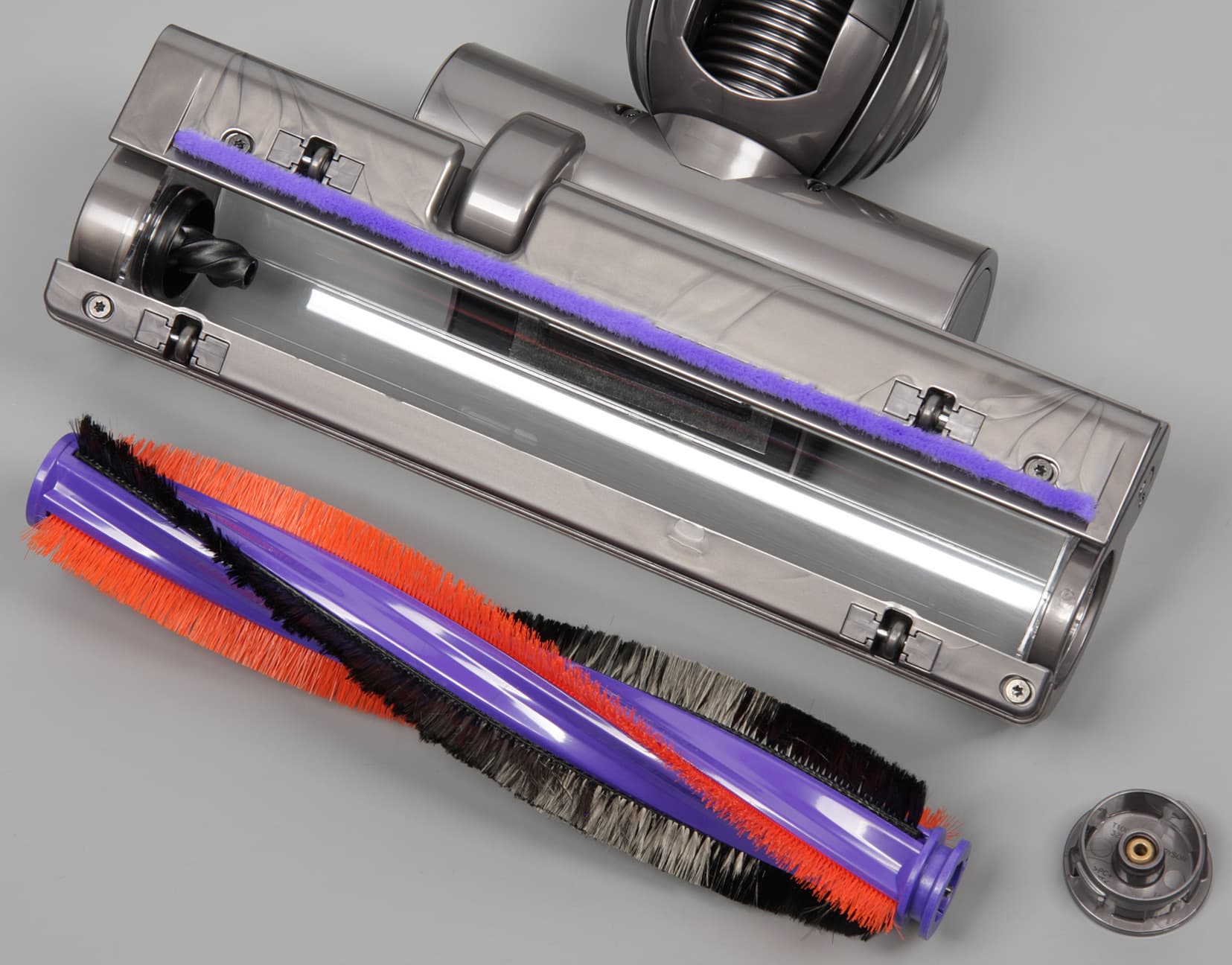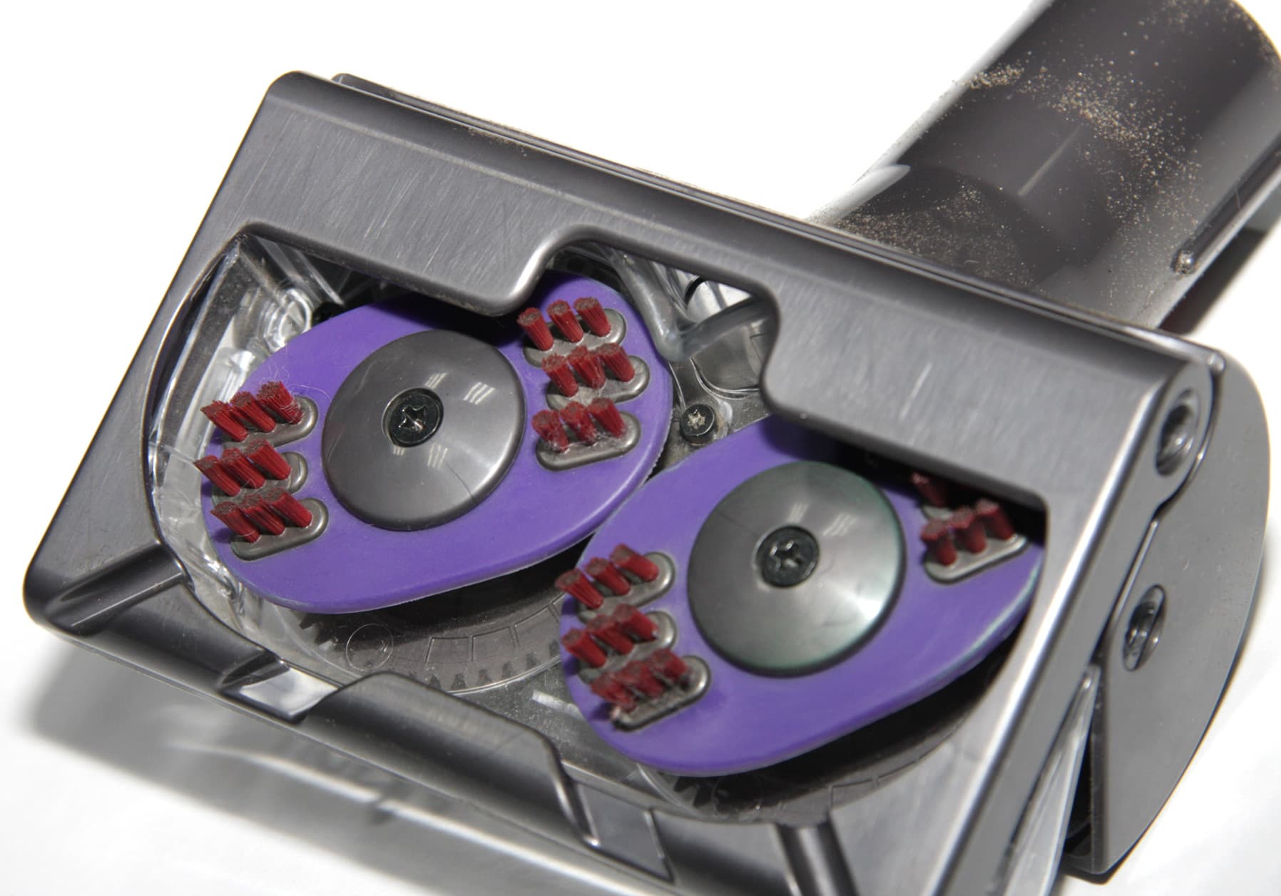Основная широкая насадка имеет вращающуюся щетку с приводом от небольшой турбинки, которую закручивает всасываемый воздух.