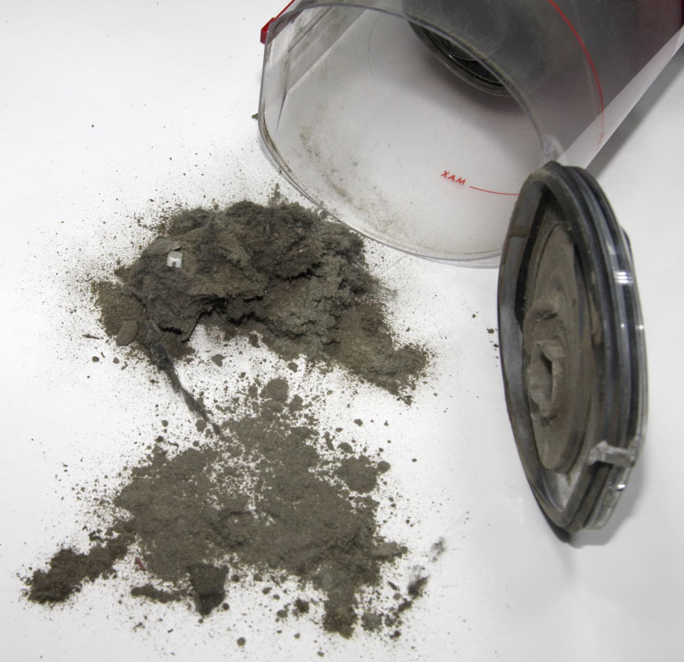 Почти весь мусор вывалился после сдвигания стакана вниз и отщелкивания крышки. Красная резиновая юбочка на стакане хорошо счистила мусор с сетки большого циклона.