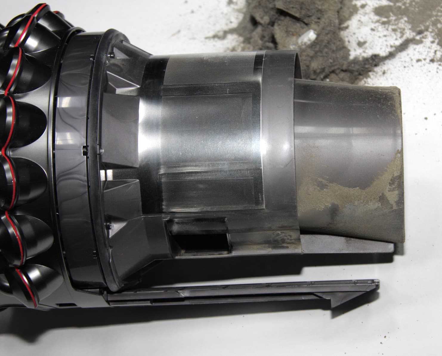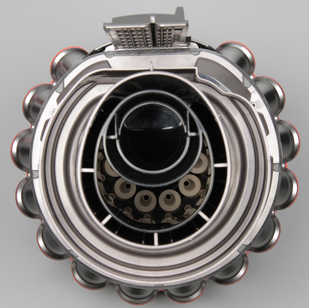 Чаще всего на этом можно будет и остановиться, но при необходимости можно отделить прозрачный стакан и вымыть его (только его!) под холодной водой. Система фильтрации трехступенчатая. Цилиндрический корпус пылесборника формирует большой циклон первой ступени, на которой отделяется большой и тяжелый мусор, легкий и крупный мусор, типа волокон и шерсти задерживается сеткой из нержавеющей стали. Финальную очистку воздуха выполняют множество мелких циклонов, которые сепарируют мельчайшую пыль и воздух, пыль сваливается в контейнер пылесборника, а воздух идет к вентилятору. Возможно, мелкие циклоны объединены в группы, и для достижения лучшего результата очистка воздуха осуществляется в группах последовательно. Гибкие кончики циклонов вибрируют в потоке воздуха и стряхивают вниз налипшую пыль.