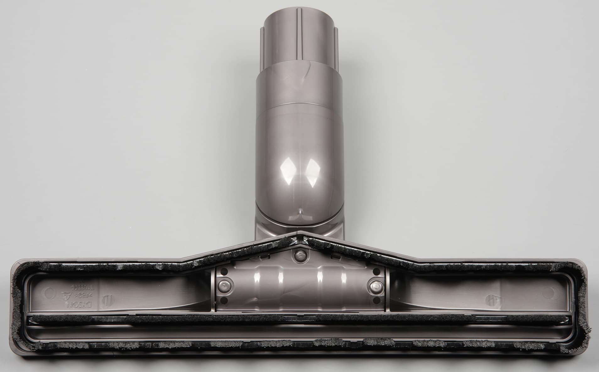 В движение щетки приводятся тоже с помощью турбинки и шестереночного редуктора. Воздух для турбинки забирается через сеточку сверху на корпусе насадки. При ширине насадки в 125 мм рабочая ширина составляет 117 мм (по длине выреза). Следующая насадка — это плоская насадка для уборки твердых поверхностей.
