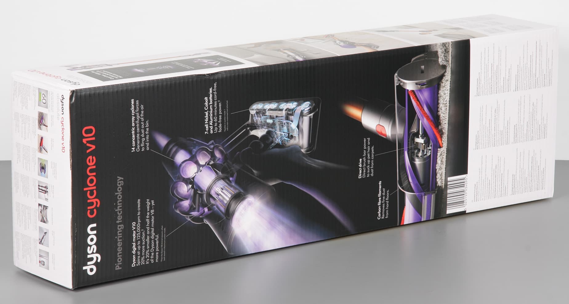 Для упаковки используется небольшое количество пластиковой пленки, а для защиты и распределения комплектующих применяются вставки и перегородки из гофрокартона. Изготовлен пылесос в Малайзии. Отметим, что сейчас в компании Dyson налажены две производственные линии Dyson Cyclone V10: в Малайзии и на Филиппинах.