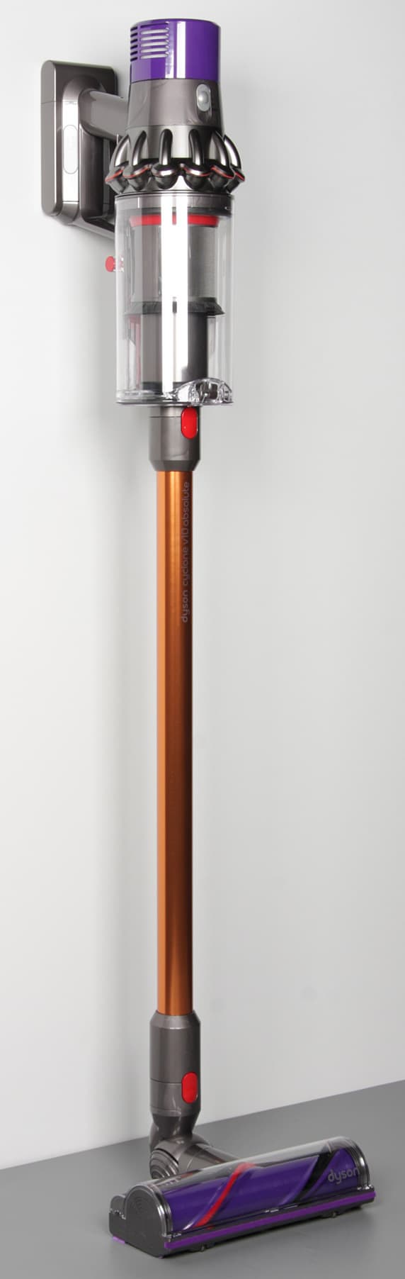 На момент написания этого текста в российской рознице предлагались три комплектации/модификации Dyson Cyclone V10. Они различаются цветом трубы и количеством насадок: Motorhead — три насадки, Animal — пять насадок, Absolute — шесть насадок. К тому же у Motorhead объем пылесборника уменьшен до 0,54 л, тогда как у двух других он составляет 0,76 л. У нас на тестировании побывал Cyclone V10 Absolute с самой богатой комплектацией.