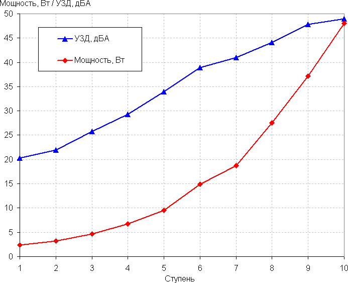 Уровень шума мы измеряли при размещении Dyson Pure Cool на полу в вертикальном положении. Микрофон шумомера размещался на высоте 1,2 м от пола (примерно на высоте уха сидящего на стуле человека), на расстоянии 1 м сбоку от корпуса очистителя и был направлен на него. На графике ниже приведены взвешенные значения уровня звукового давления и значения потребляемой мощности для десяти степеней мощности обдува.