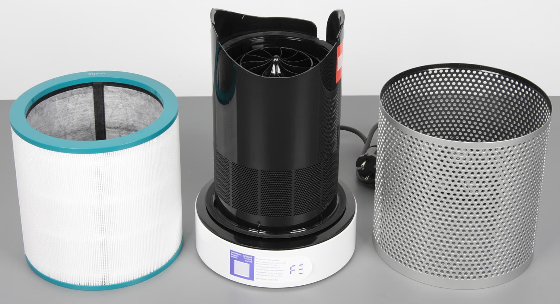 Фильтрующий элемент цилиндрический, отверстия на внешней решетке и в нижней части моторного блока позволяют забирать воздух со всех сторон очистителя, что производитель отмечает как одно из достоинств. Фильтр состоит из нескольких слоев, сначала идет пластиковая сеточка, задерживающая крупную пыль, потом складчатый фильтр HEPA из боросиликатного стекловолокна, далее — слой с активированным углем. Уголь имеет пропитку из соединения трис (трис(гидроксиметил)аминометана), которое помогает удерживать вредные вещества. В частности формальдегид реагирует с трис с образованием нового соединения, то есть формальдегид химически связывается и не будет десорбироваться со временем обратно в воздух. Резиновые уплотнители исключают паразитный подсос воздуха мимо фильтра. Устройство запрограммировано на выдачу напоминания о замене фильтра через 12 месяцев, исходя из 12-часового ежедневного использования. При более интенсивном использовании напоминание появится раньше, также не исключено, что эксплуатация в условиях с повышенной загрязненностью воздуха потребует более частой замены фильтра.