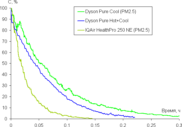 В таблице выше приведено время, которое требуется на снижение концентрации загрязнения в два раза для площади помещения в 35 м² с высотой потолков 2,75 м. Получается, что очиститель Dyson Pure Cool где-то за 6,5 ч (390 минут) снизит концентрацию загрязняющих веществ (в виде мелкодисперсных частиц) в воздухе в 1000 раз в помещении с объемом объем 96,25 м³, что в большинстве случаев можно принимать за полную очистку. Отметим, что производитель для скорости очистки от газообразных веществ приводит следующие данные: «Улавливание газов соответствует стандарту GB/T18801. После 60 минут работы в помещении площадью 30 м³ удаляет 90% бензола и 80% формальдегида».