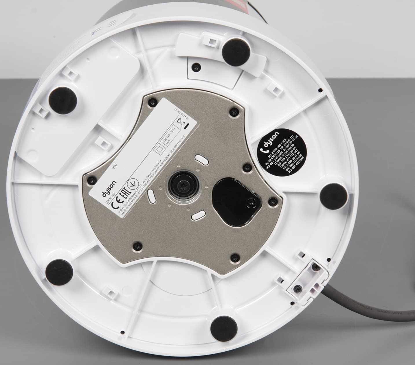 К электрической сети устройство подключается кабелем питания длиной 1,8 м с евровилкой на конце. Кабель имеет среднюю жесткость. Отметим, что на Dyson Pure Cool установлена гарантия в два года. Изготовлен побывавший у нас на тестировании экземпляр в Малайзии.