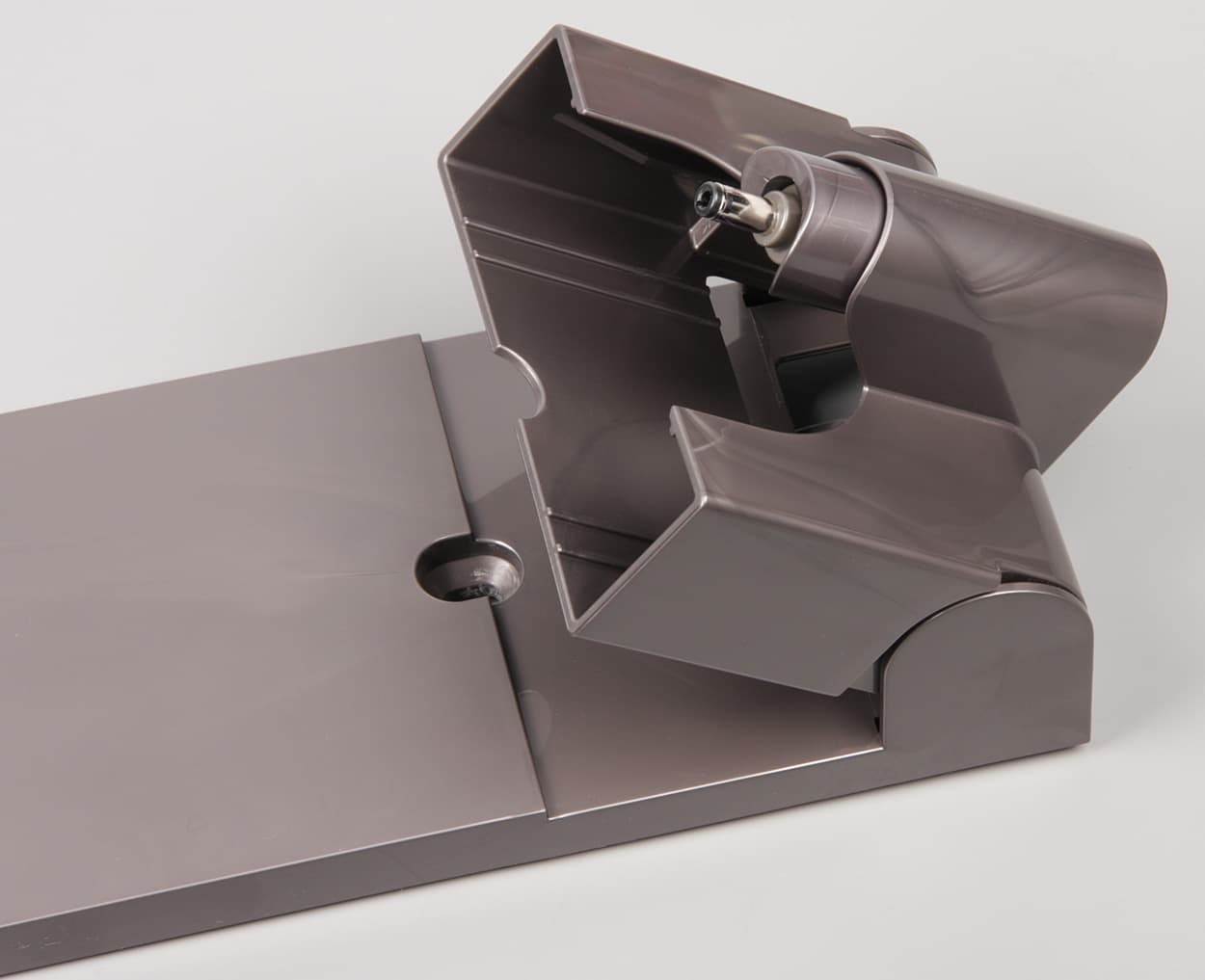 Этот кронштейн в двух точках привинчивается к стене или к другой вертикальной поверхности. Пылесос легко вставляется в кронштейн и снимается с него, на нем же и заряжается, так как в кронштейне закрепляется разъем от адаптера питания, и этот разъем при установке пылесоса входит точно в ответный разъем на ручке.