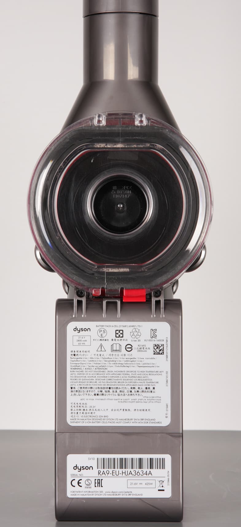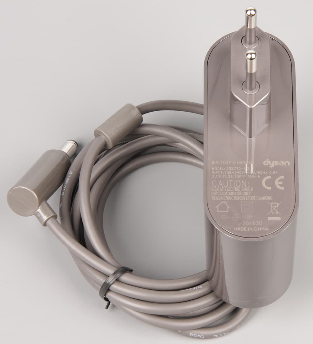 Отметим, что в режиме с нормальной мощностью увеличение времени работы достигнуто как за счет увеличенной емкости батареи, так и за счет небольшого снижения мощности всасывания. Судя по обозначениям, батарея для V8 собрана из элементов типа 21700. В батарее их также 6, но они больше по размеру и имеют бо́льшую емкость по сравнению с элементами 18650, применяемыми в V6.