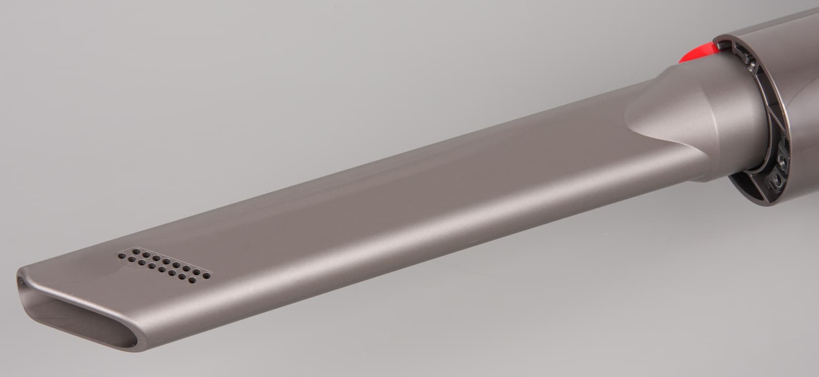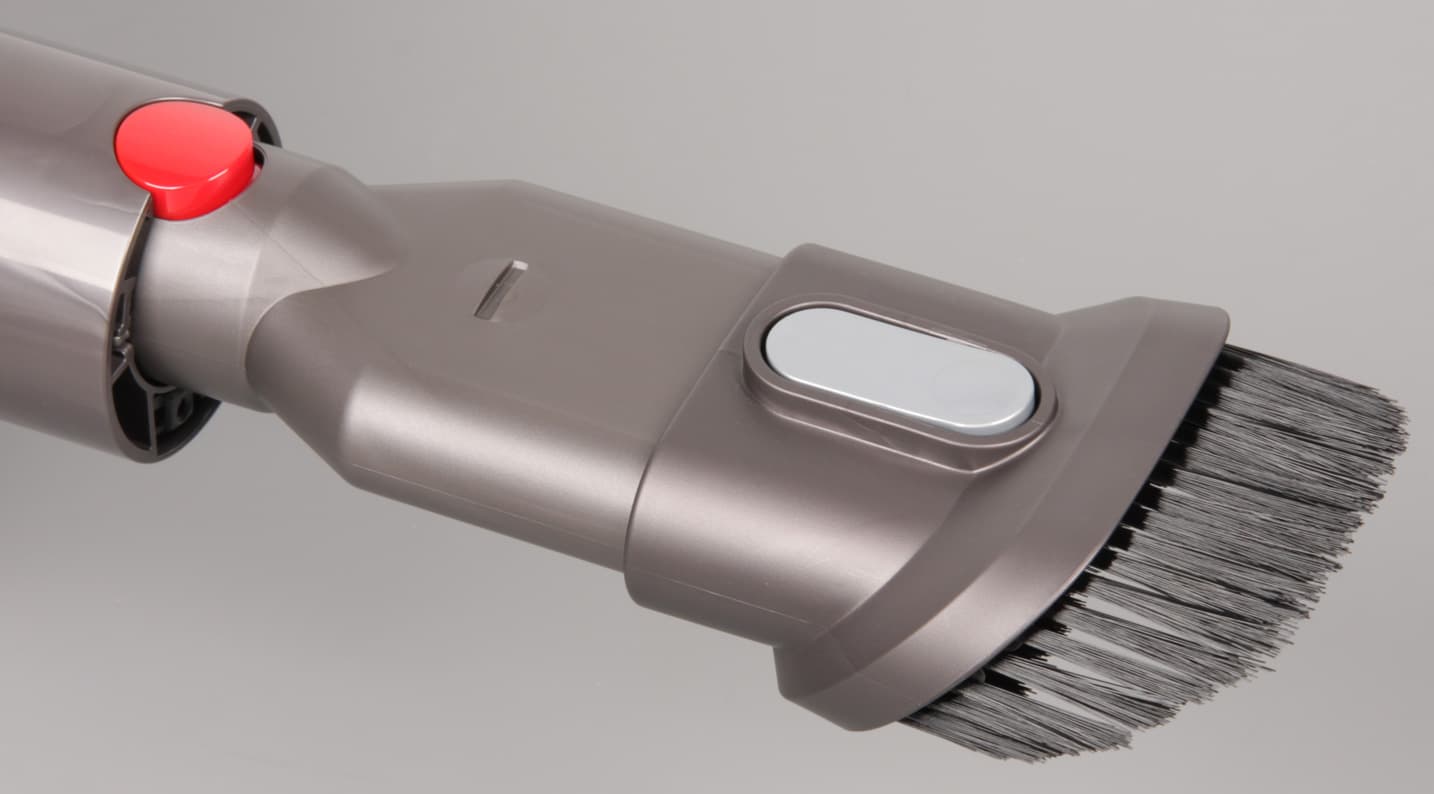Она достаточно длинная (213 мм), чтобы забираться в потаенные места накопления пыли, и с рядом отверстий на боковой поверхности, помогающих сохранять необходимый для работы циклонов и охлаждения мотора поток воздуха при полном перекрытии входного отверстия насадки. Длина от кончика щелевой насадки с установленной трубой до кнопки включения составляет больше метра, то есть на столько пользователь может максимально удлинить свою руку при использовании этого пылесоса. Вторая насадка — это комбинированная насадка с входным отверстием пошире и со сдвижной щеткой из относительно длинной и нежесткой нейлоновой щетины.