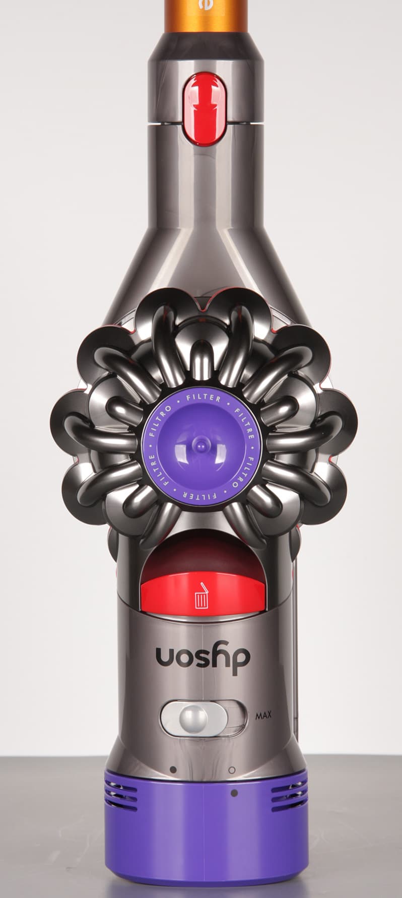 Прозрачный корпус пылесборника позволяет оценить степень его заполнения с первого взгляда. Дно пылесборника сделано откидывающимся, для этого достаточно потянуть блок циклонов вверх до упора за красную ручку с изображением мусорного бака.