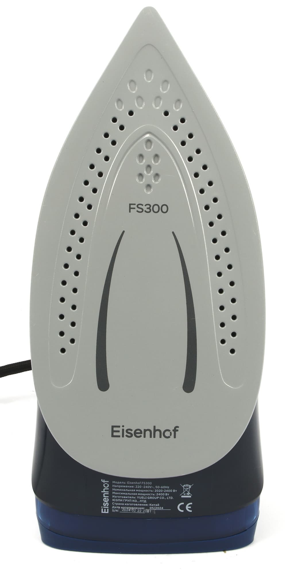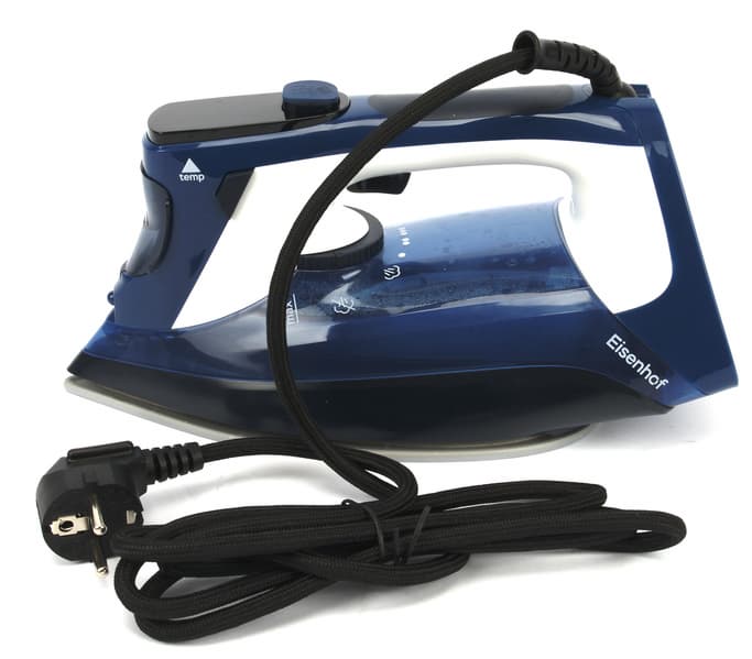 Утюг Eisenhof FS300 выглядит основательно за счет широкой выступающей вперед ручки с дисплеем. В остальном конструкция утюга стандартная и вопросов не вызывает. Пластиковый корпус выполнен в сочетании синего, черного и белого цветов.