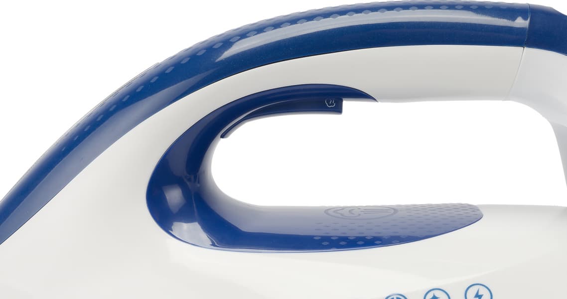 Вес утюга средний (1,15 кг), в руке ощутим, но дискомфорта не вызывает. Держать утюг удобно, единственный элемент управления в виде клавиши подачи пара расположен в привычном месте — с внутренней стороны ручки.